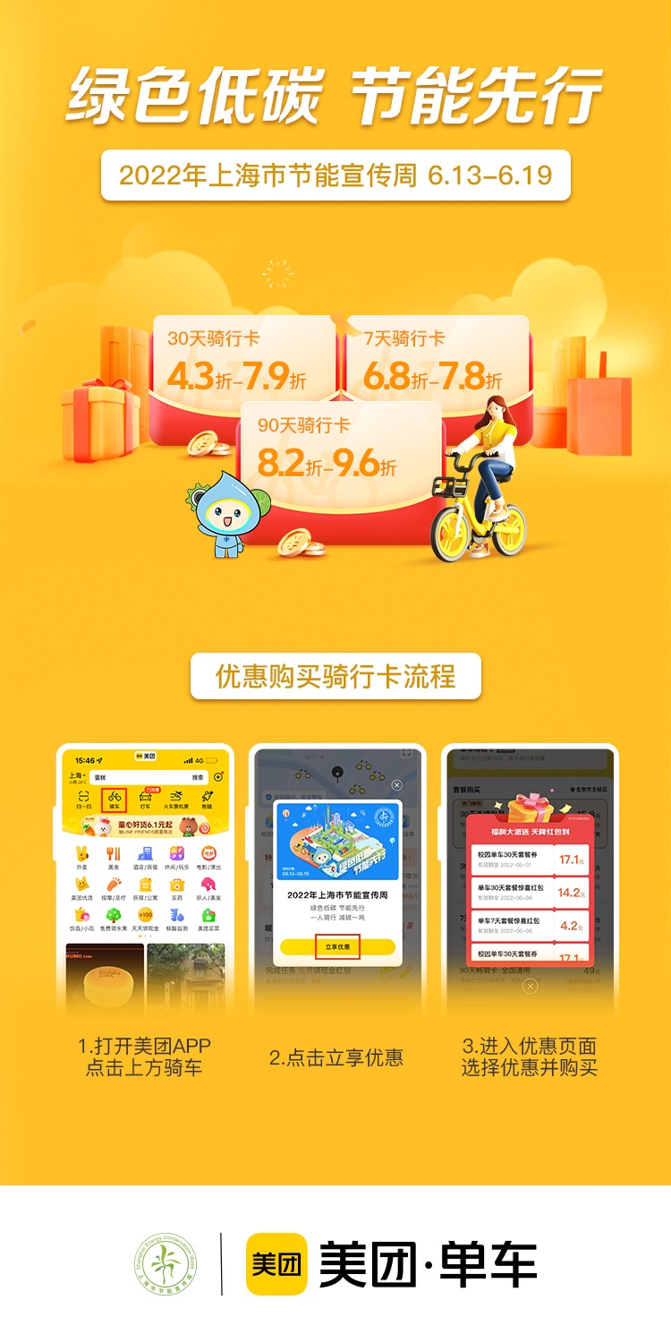 2022年上海市节能宣传周期间,美团单车围绕“绿色低碳 节能先行”主题,在本市推出“一人骑行 减碳一吨”优惠骑行活动,上海市民通过美团App骑行入口,可随机获取购卡优惠,购买30天骑行卡最低4.3折起,7天骑行卡最低6.8折起,90天骑行卡最低8.2折起。