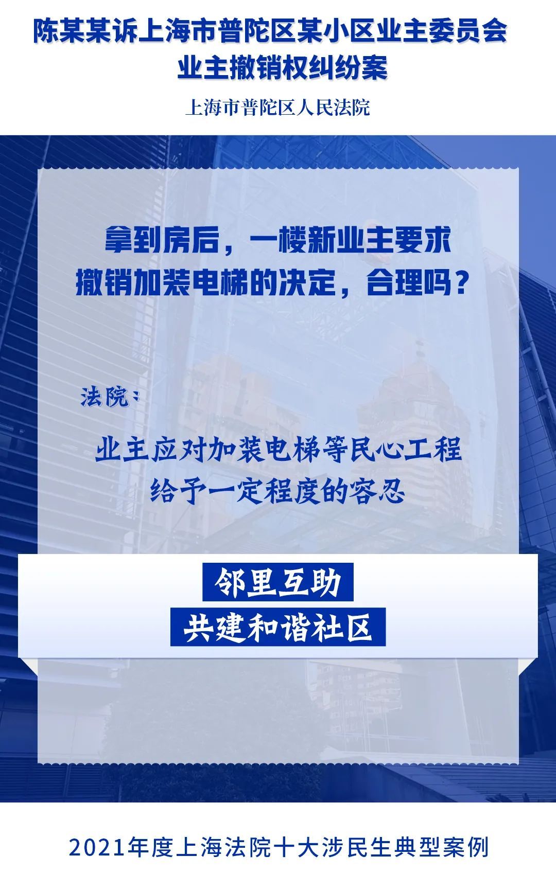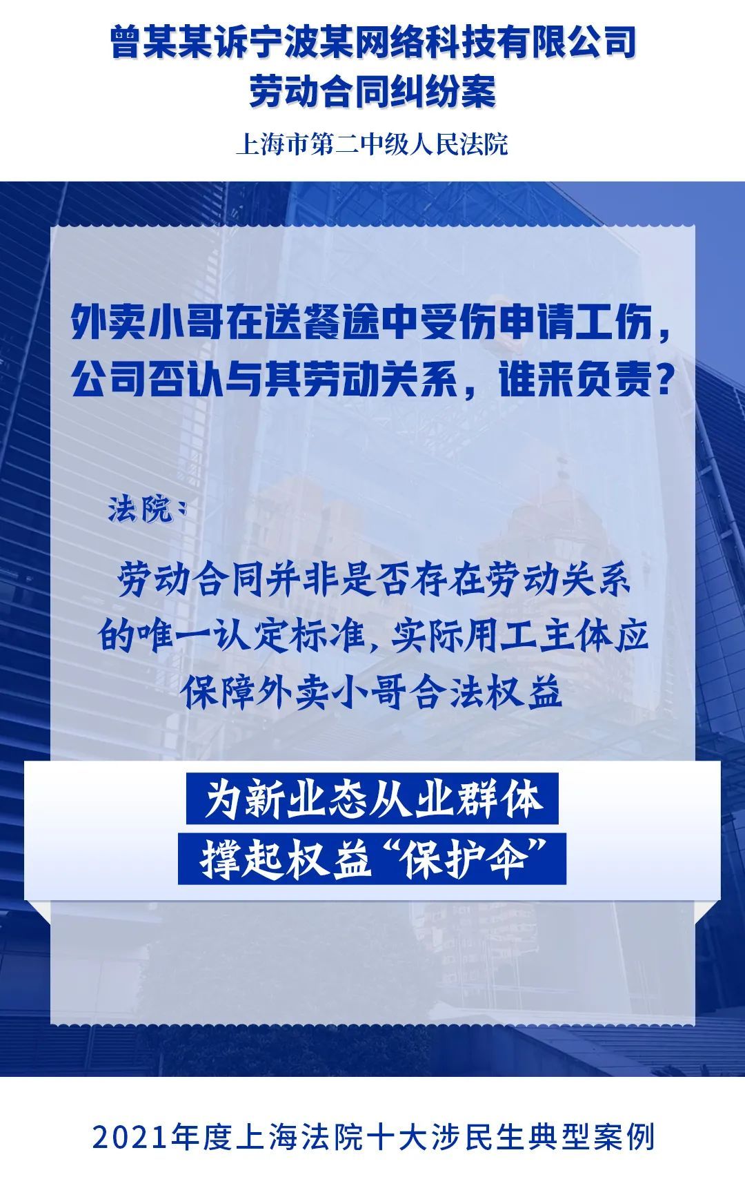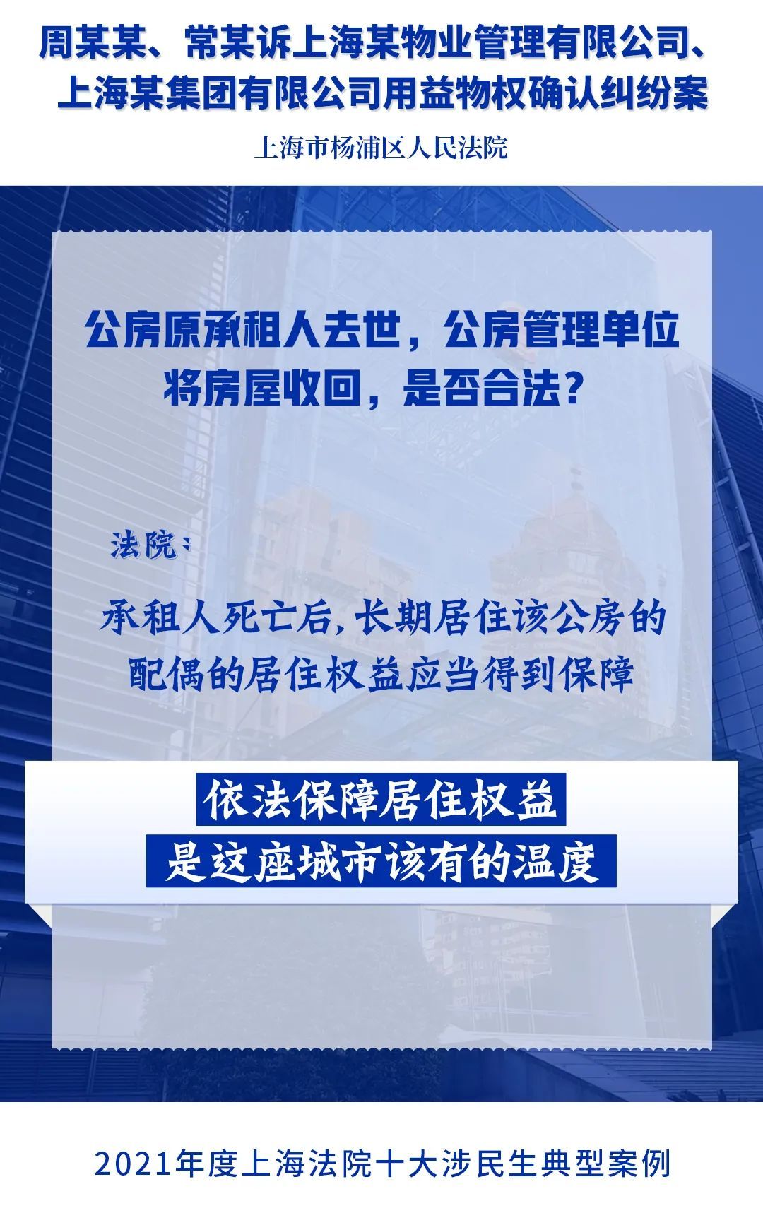 为进一步落实人民法院司法保障人民群众高品质生活的要求,充分发挥民事审判在社会治理中的规则引领和价值导向作用,今年2月,上海市高级人民法院开展2021年度上海法院涉民生典型案例展评活动。经全市法院推荐,从全市法院报送的105起案例中精选出20起典型案例,通过专业评选和网络展评投票,最终评选出“2021年度上海法院十大涉民生典型案例”和“2021年度上海法院十大涉民生典型案例”提名奖,现将评选结果通报如下。