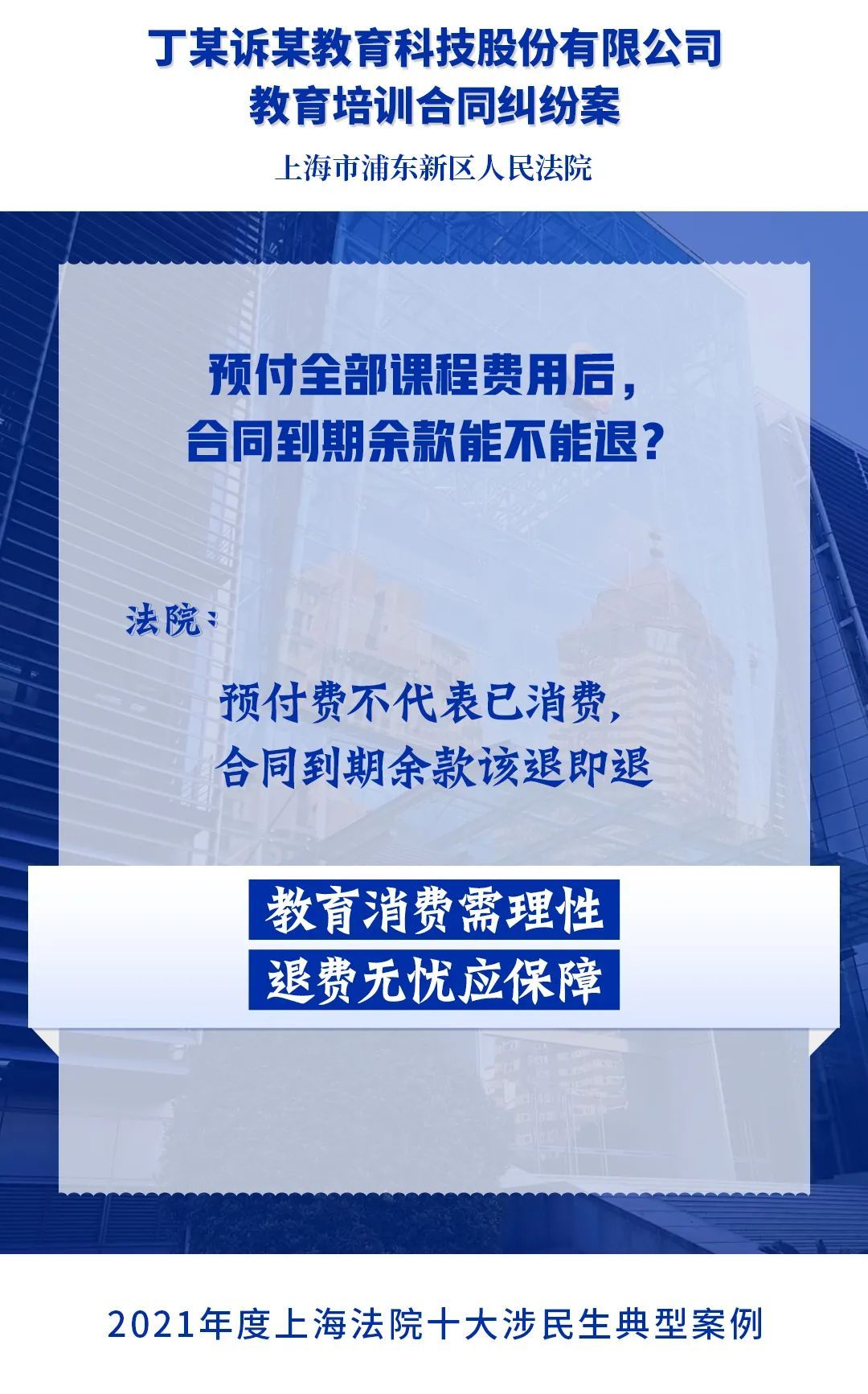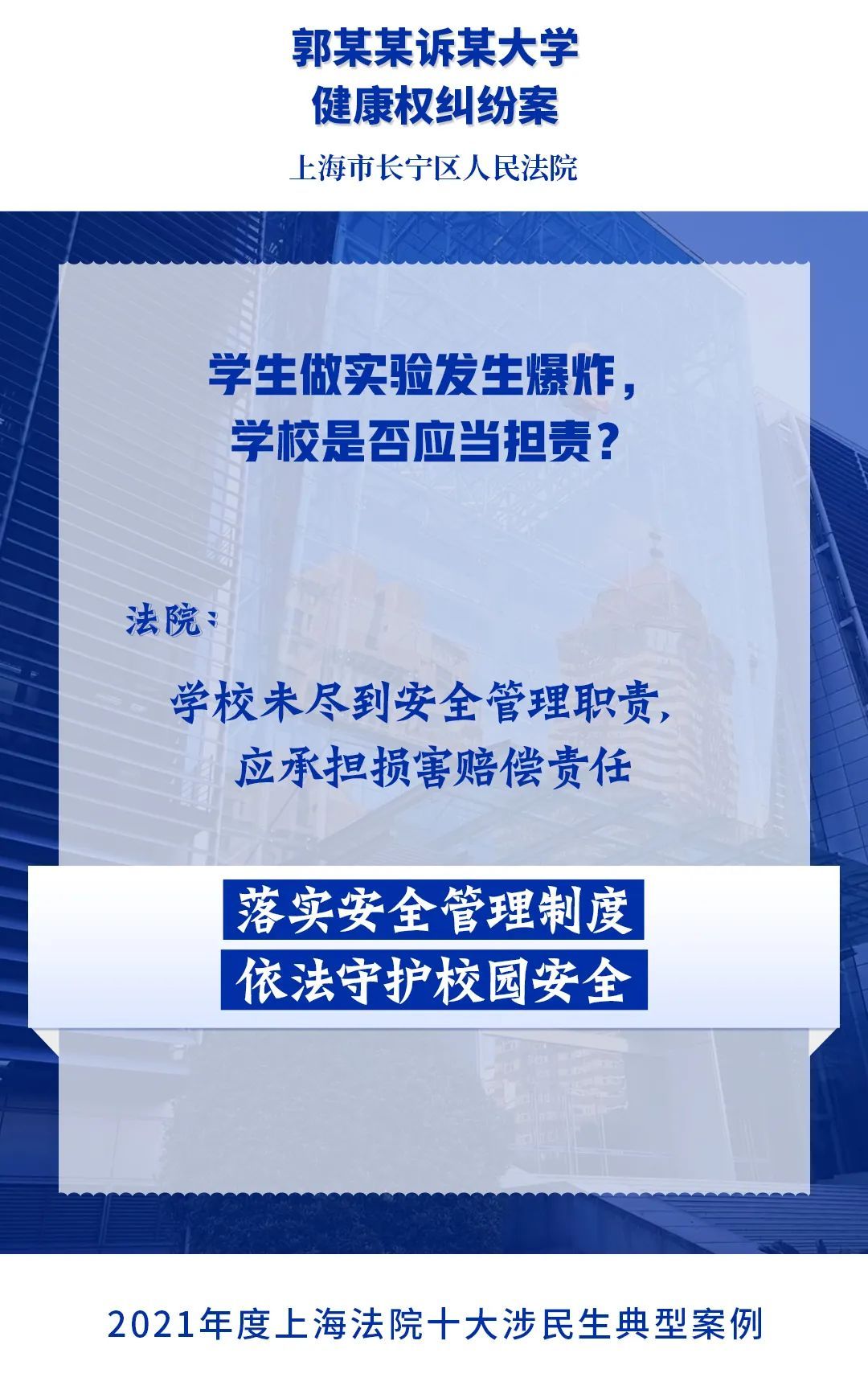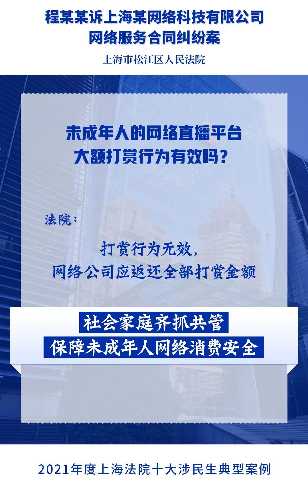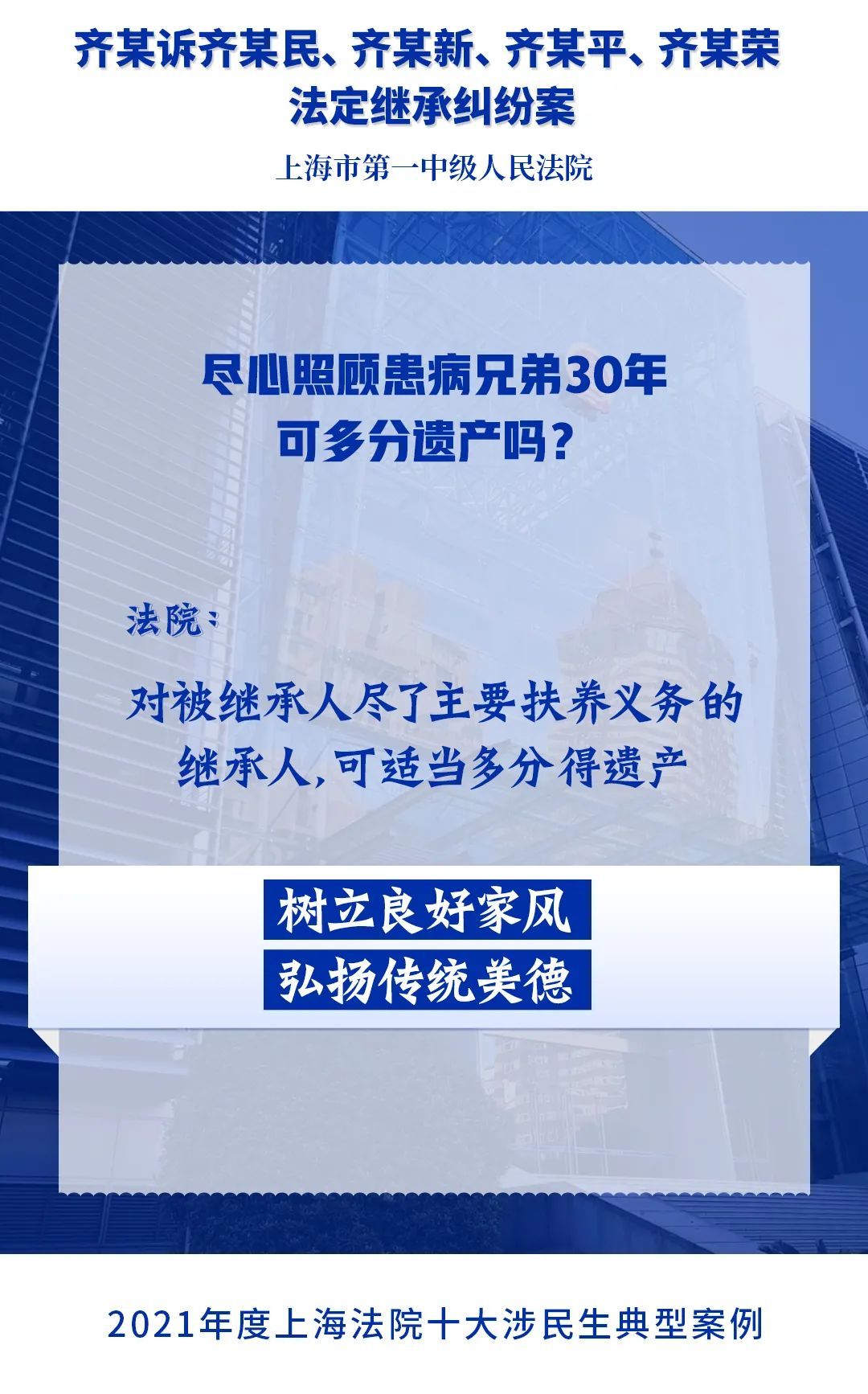 为进一步落实人民法院司法保障人民群众高品质生活的要求,充分发挥民事审判在社会治理中的规则引领和价值导向作用,今年2月,上海市高级人民法院开展2021年度上海法院涉民生典型案例展评活动。经全市法院推荐,从全市法院报送的105起案例中精选出20起典型案例,通过专业评选和网络展评投票,最终评选出“2021年度上海法院十大涉民生典型案例”和“2021年度上海法院十大涉民生典型案例”提名奖,现将评选结果通报如下。