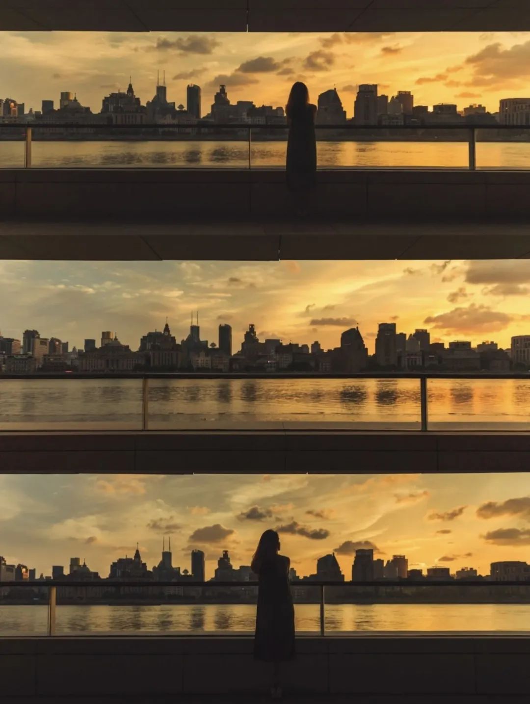 外滩的万国建筑群,被落日余晖笼罩泛着金色的光晕,这样的落日好久不见。
