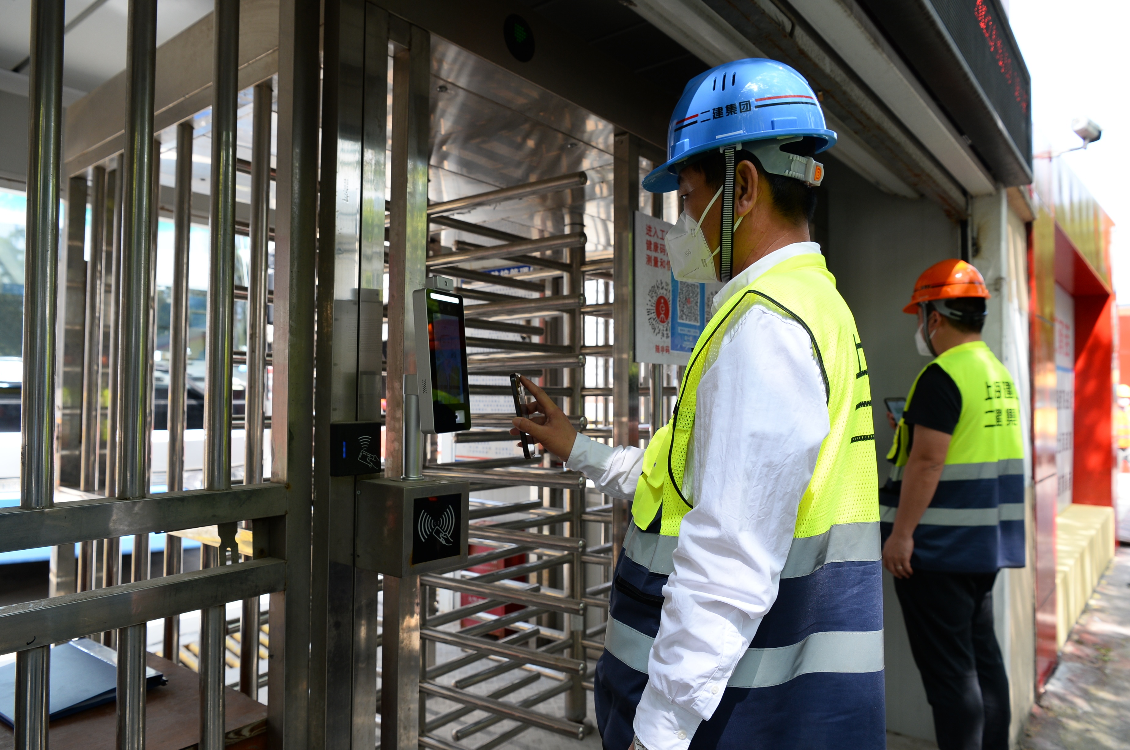 72号街坊项目重新进入现场施工,首先要把好的就是疫情防控关。72号街坊项目经理张瑞介绍说,72号项目各项防疫方案、物资准备、人员管理等都严格对照主体责任落实到位,同时加强工地现场管理,“项目建设人员全部实施闭环管理,每天上午六点,由大巴从生活区点对点运送到建设工地。进入工地前,需要扫描‘数字哨兵’,同步完成验码和测温,一步都不能少。施工人员每天进行一次抗原自测,每两天进行一次核酸检测,做到疫情防控和建设施工两不误。”