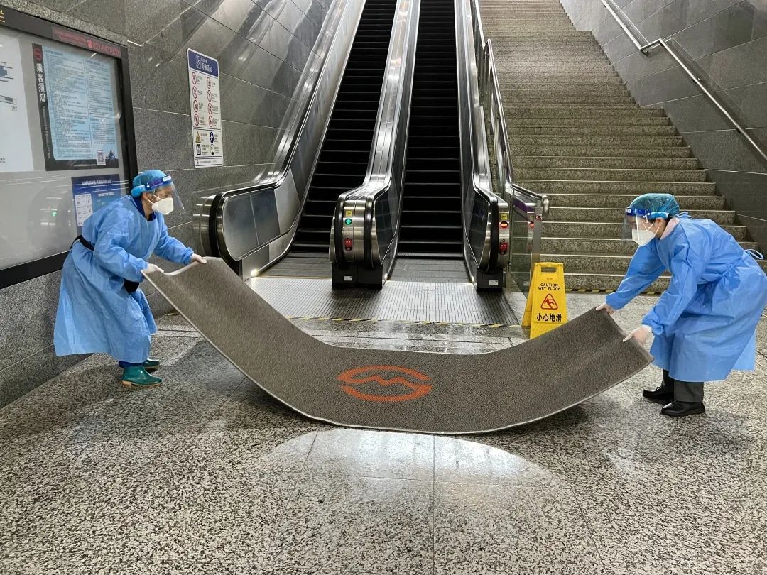车站各出入口铺设防滑毯,放置“小心地滑”警示牌