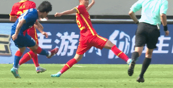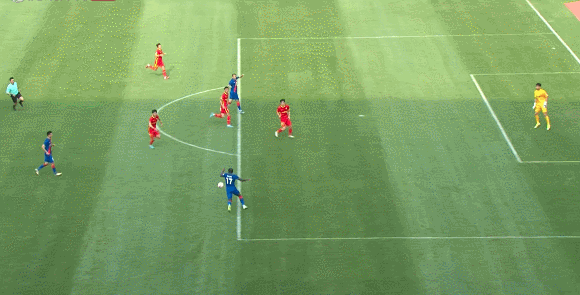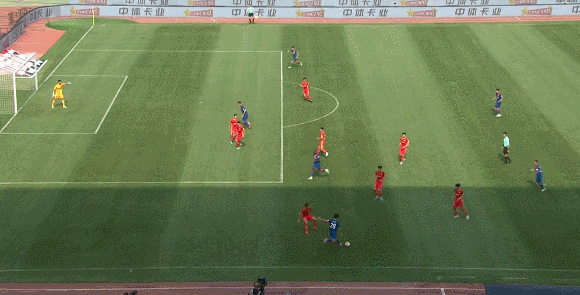 51分5秒,刘若钒禁区内横向带球后推射,被门将挡出,球正好落在曹赟定身边,曹赟定顺势头球顶空门破门。
