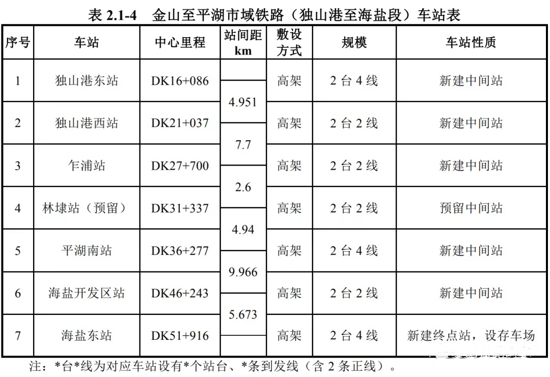 ▲金山至平湖市域铁路(独山港至海盐段)车站表