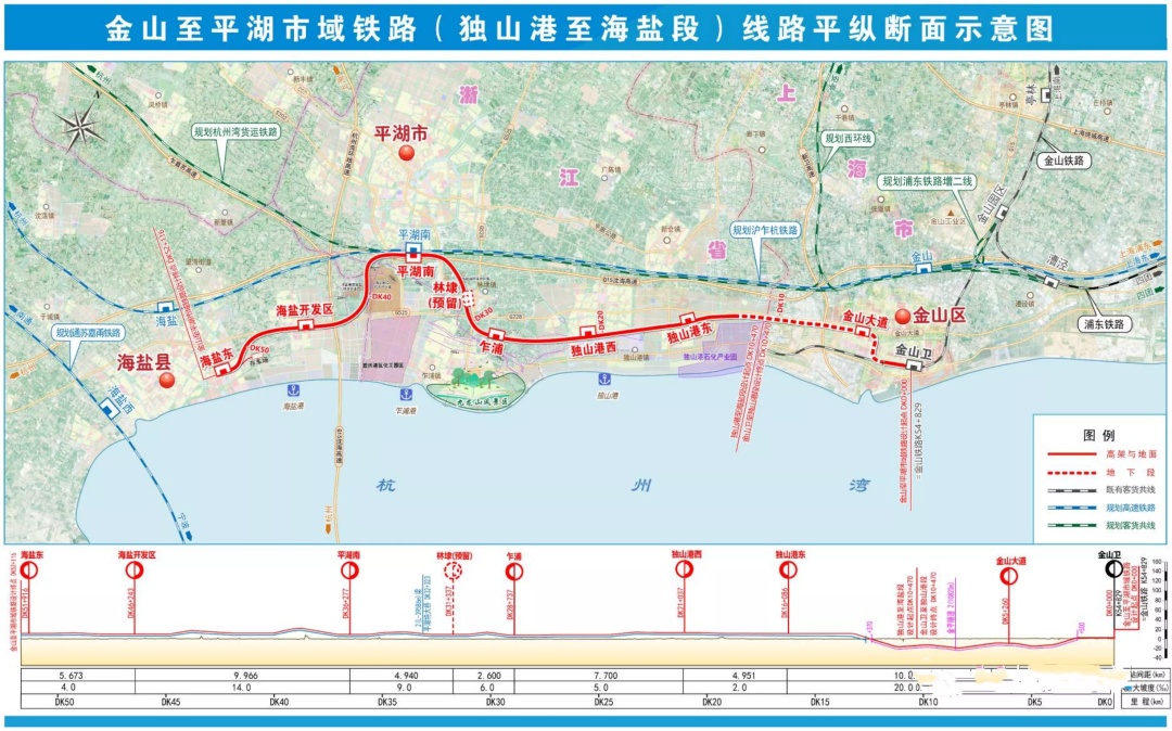 ▲金山至平湖市域铁路(独山港至海盐段)线路平纵断面示意图