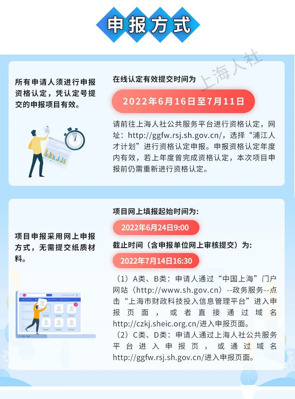为进一步支持和鼓励海外优秀留学人员来沪工作和创业,市人社局、市科委联合启动实施2022年度上海市浦江人才计划(简称“浦江计划”),项目申报工作开始了!申报要求等更多信息详见↓