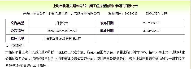 上海地铁官网日前发布了轨道交通一期工程房屋检测多个标段项目的招标公告。公告显示,招标项目上海市轨道交通23号线一期工程已批准实施,项目已具备招标条件,现对一期工程房屋检测1标、2标、3标项目进行公开招标。