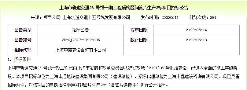 该官网还发布了一期工程盾构区间管片生产1标和生产2标项目的招标公告。