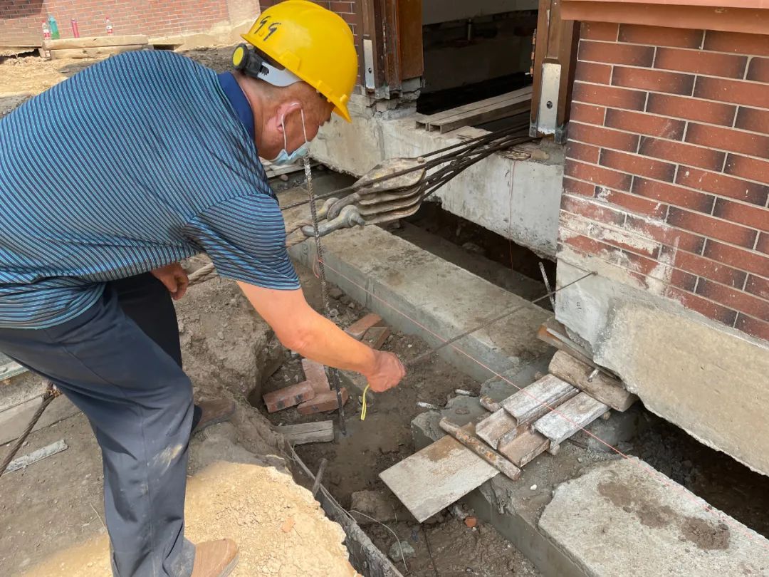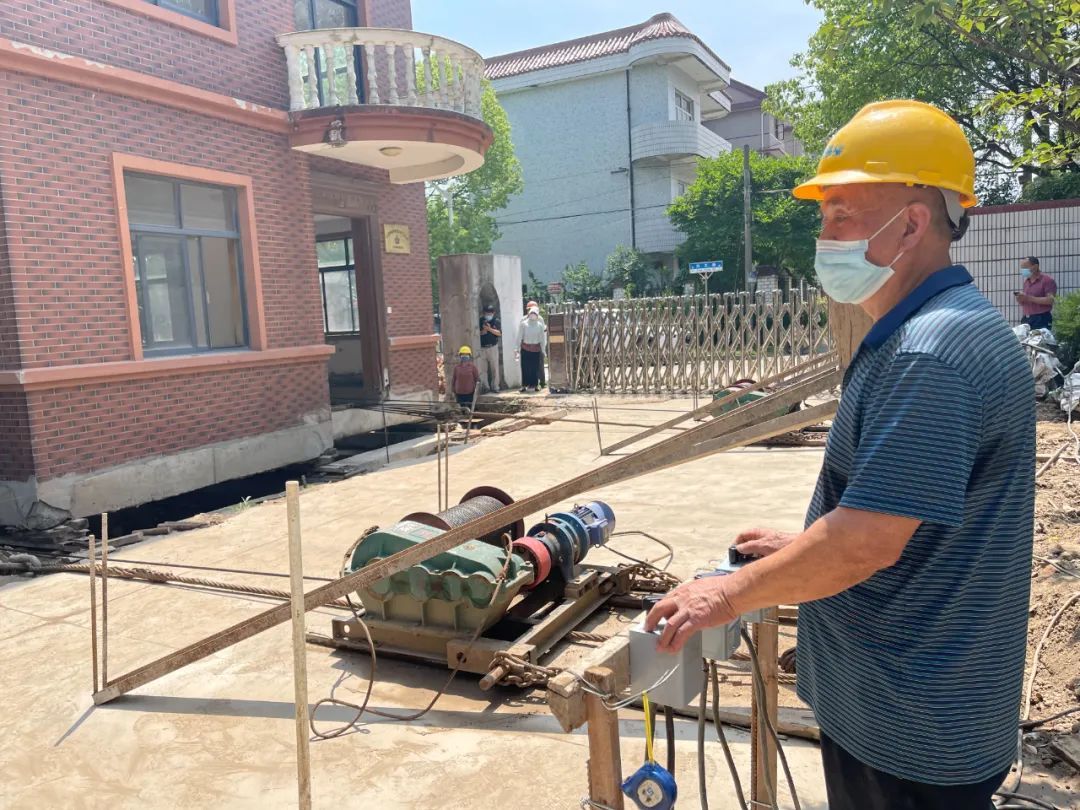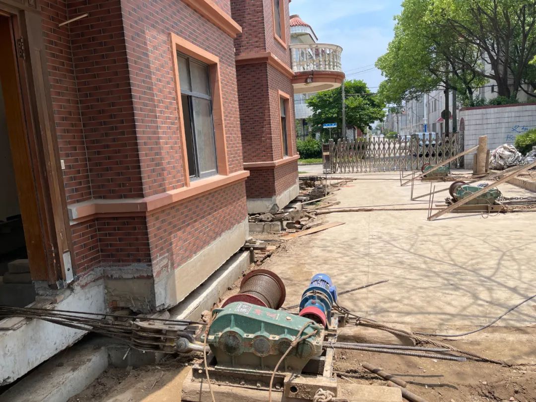 据现场施工人员介绍,本次平移工程采用了3台电动卷扬机同时进行。整个平移工程难点在行走轨道平整度控制和建筑物平移同步性控制,因此此次平移工程的速度比较慢,工人们每平移30~40公分时就要停下来检查和测量。