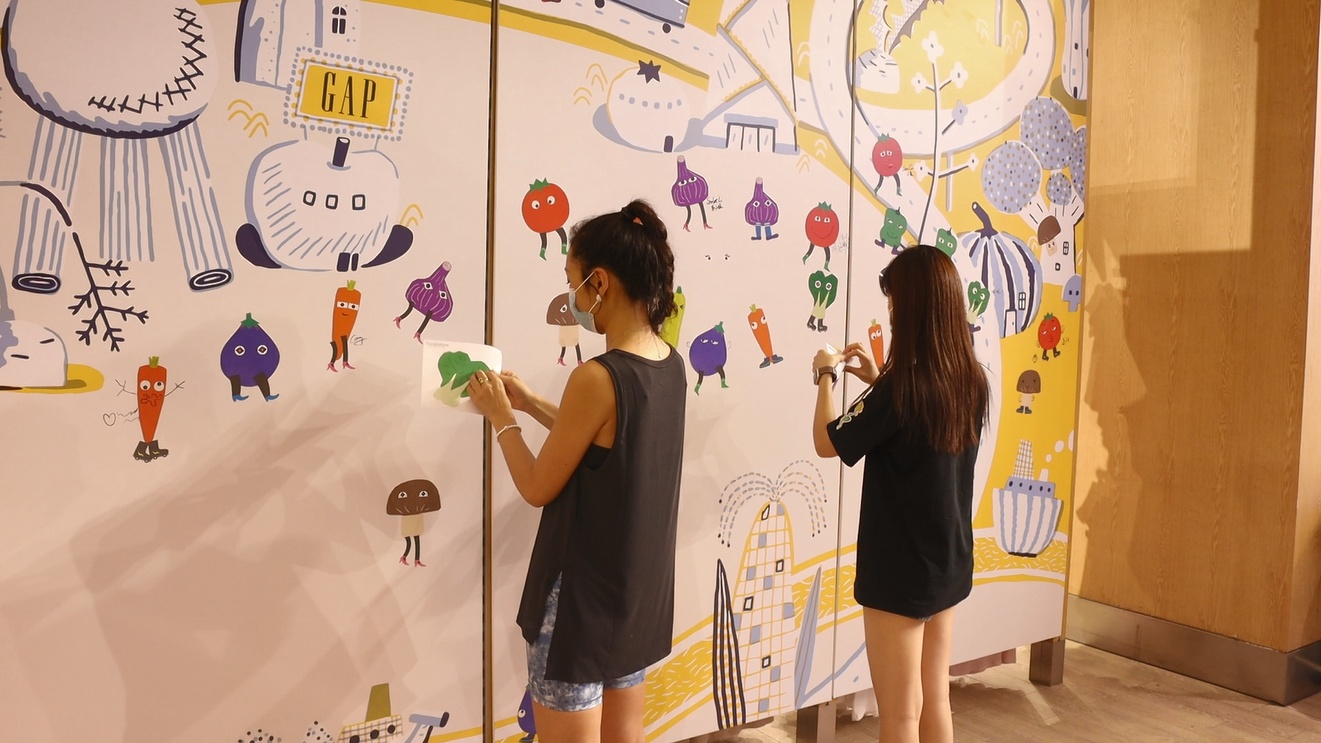 与此同时,6月16日,Gap南京西路旗舰店还在一楼推出以“蔬菜”为主题的互动活动——顾客可以通过自由组合现场提供的趣味贴纸,快速创作出独一无二的蔬菜人物并张贴在店内的巨幅“蔬菜城市”画卷墙上,用与众不同的诙谐创意,一起绘造出心中那个有活力有能量的城市蓝图。