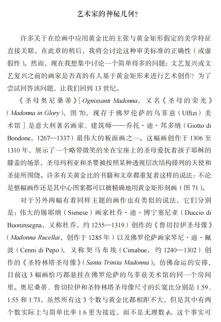 黄金比(又称黄金比例、黄金分割,数值为0.618…或1.618…)具有悠久的历史,它是联系数学与艺术、大自然的桥梁,常为人们津津乐道,甚至几乎每位中学数学老师在几何课上都会提到,大家都或多或少知道一些有趣事实。但关于这方面的好书却不多,因为也并不好写——如果仅仅是材料堆积,就不能成为一本精彩读物。