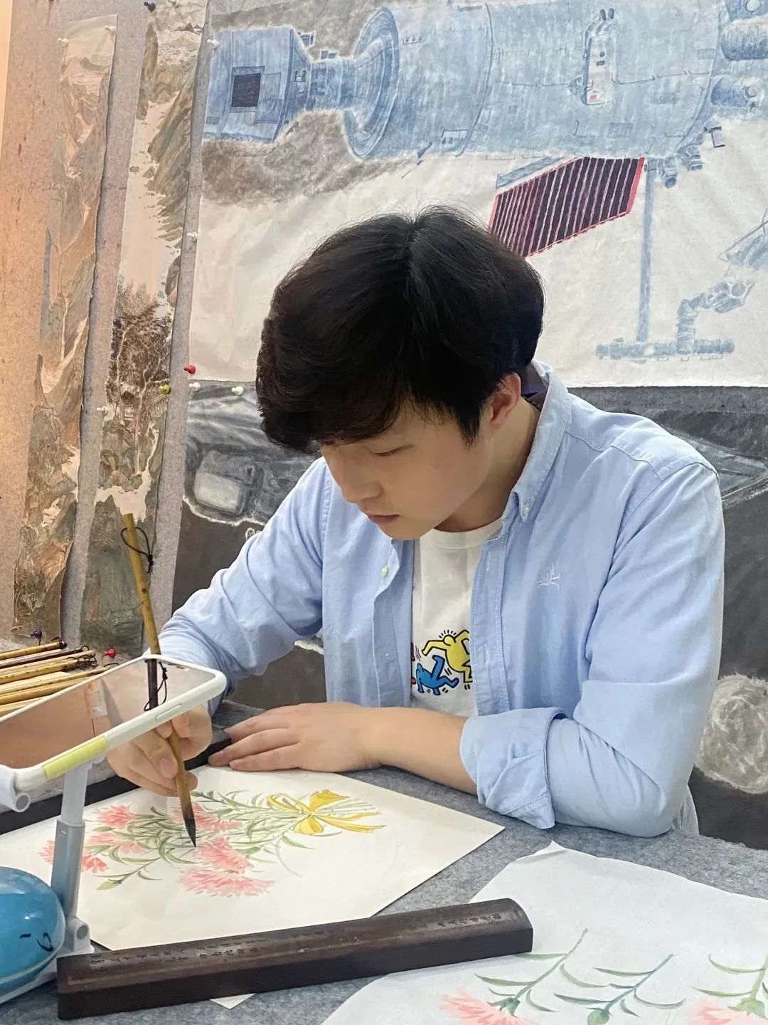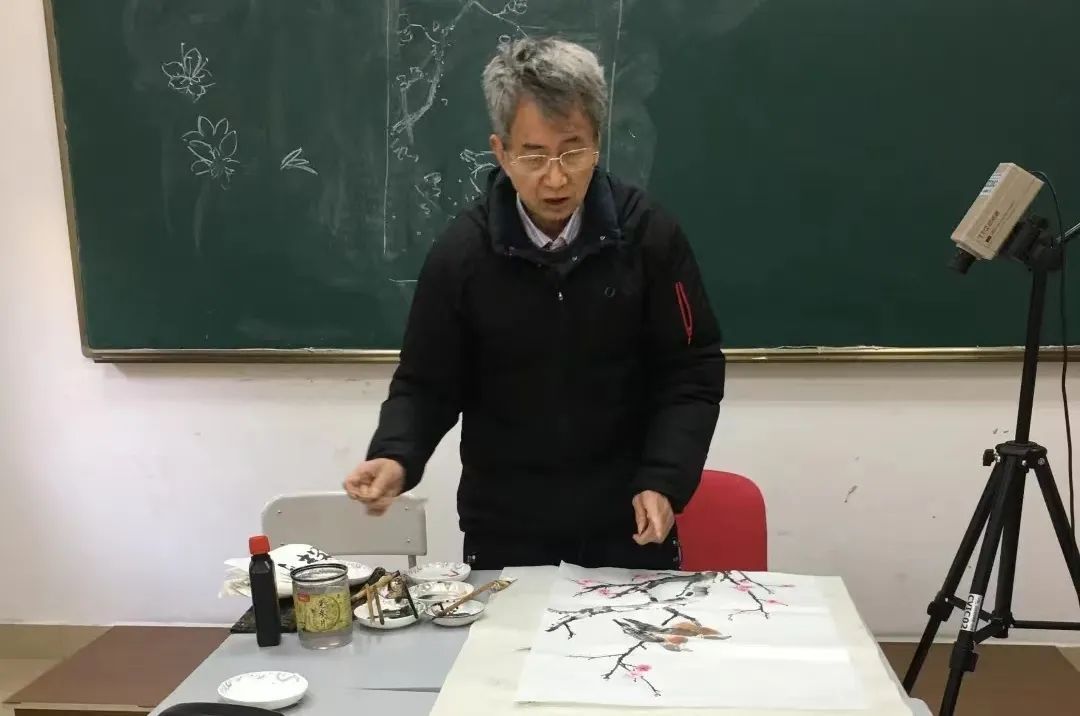 70岁的张富康老师积极投身云视课堂,由他带来的《国画花鸟》课程,将国画的重点、难点分析得细致入微,并对学员的学习情况进行指导与讲评。封控期间,张老师创作的“战疫”书画作品在学员网络微信群里广为传播,激发了学员们的创作热情,因此涌现出一大批优秀的学员作品。