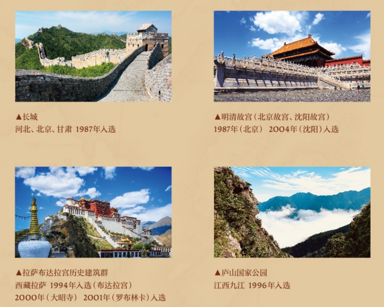 截至目前,中国已有56项世界遗产列入《世界遗产名录》,其中世界文化遗产38项、世界文化与自然双重遗产4项、世界自然遗产14项,在世界遗产名录国家排名第一位。这些都是中国最优秀的传统文化的直接见证,是中华文明的伟大结晶。