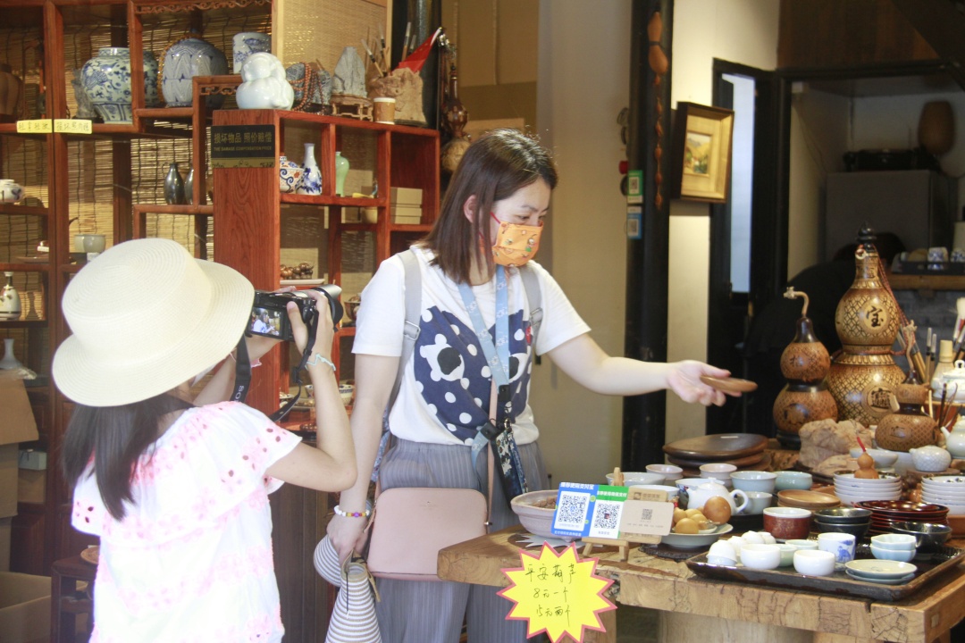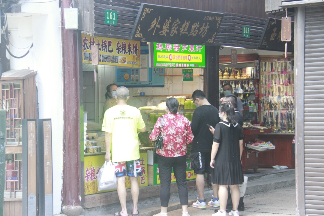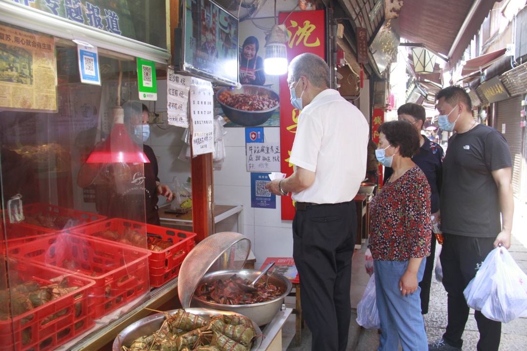 为防止聚集风险,景区暂不提供堂食。阿婆粽、扎肉等角里特色小食以及纯手工打造的文创产品店铺备受欢迎,游客在扫完店铺“场所码”后,方可与商户询价购买。