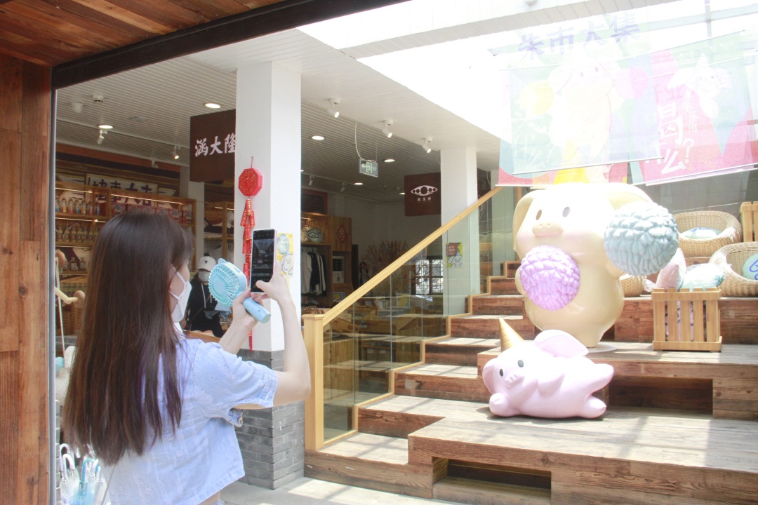 朱市大集是朱家角官方文创旗舰店,这个周末重新开张,许多游客路过便忍不住与“猪加角”IP亲密打卡。工作人员告诉记者,恢复营业后,店铺每天会用消毒液清洁柜台及文创产品,做好日常消杀工作,一些文创产品价格也比往日有所回落,后续将推出相关优惠活动和新款产品提振市场消费。