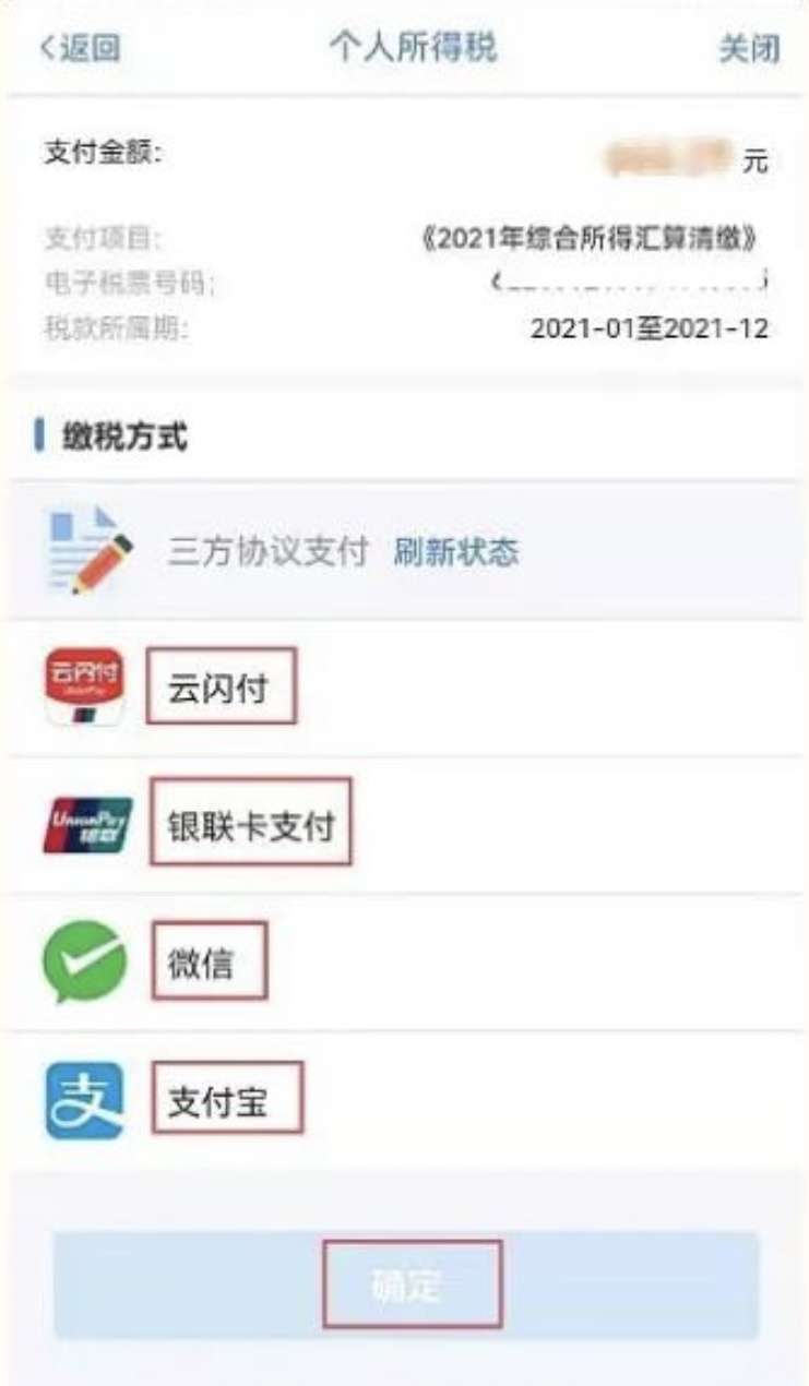 如果您需要补税,且不符合国务院规定豁免汇算义务情形的(综合所得年度收入不超过12万元或者补税金额不超过400元的),则均应当办理年度汇算补税,确认缴税后跳转到支付界面,您可以选择通过多种方式完成补税。