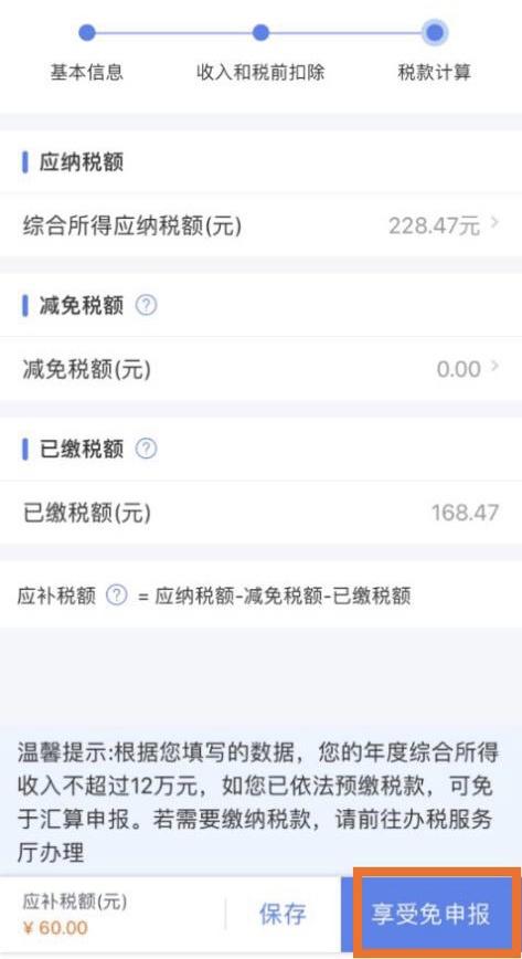 如果您需要补税,但年度综合所得收入不超过12万元,或者年度汇算需补税金额不超过400元,且在纳税年度内已依法预缴税款的,可点击“享受免申报”,无需补税。
