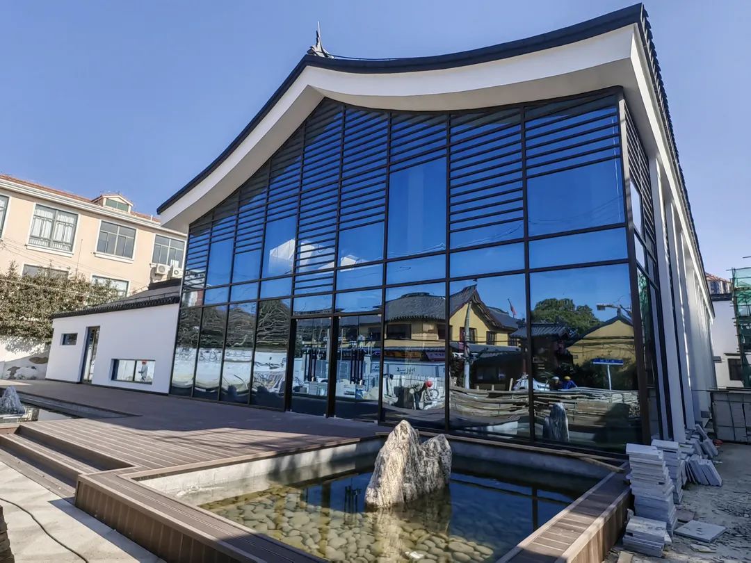 金石文化馆设计采用黑瓦白墙的江南水乡风格,符合下塘历史文化风貌区整体建筑风格。在沿用仿古建筑形式的基础上,保留原有建筑造型,融合玻璃、钢结构等现代建筑元素,表达了时代与技术进步下建筑形式更迭与转换。