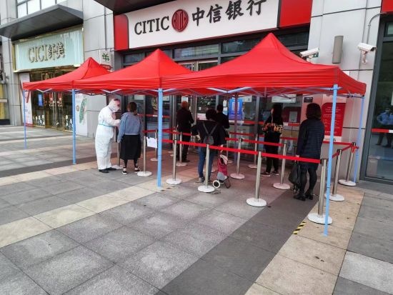 图:中信银行上海分行各网点“应开尽开”,工作人员在网点门口询问客户业务办理需求,做好分流引导