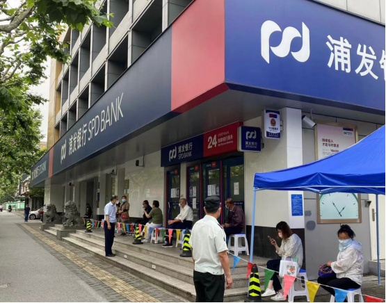 图:浦发银行上海分行有序推进全辖网点对外营业,并为等候客户提供遮阳棚、座椅等服务。
