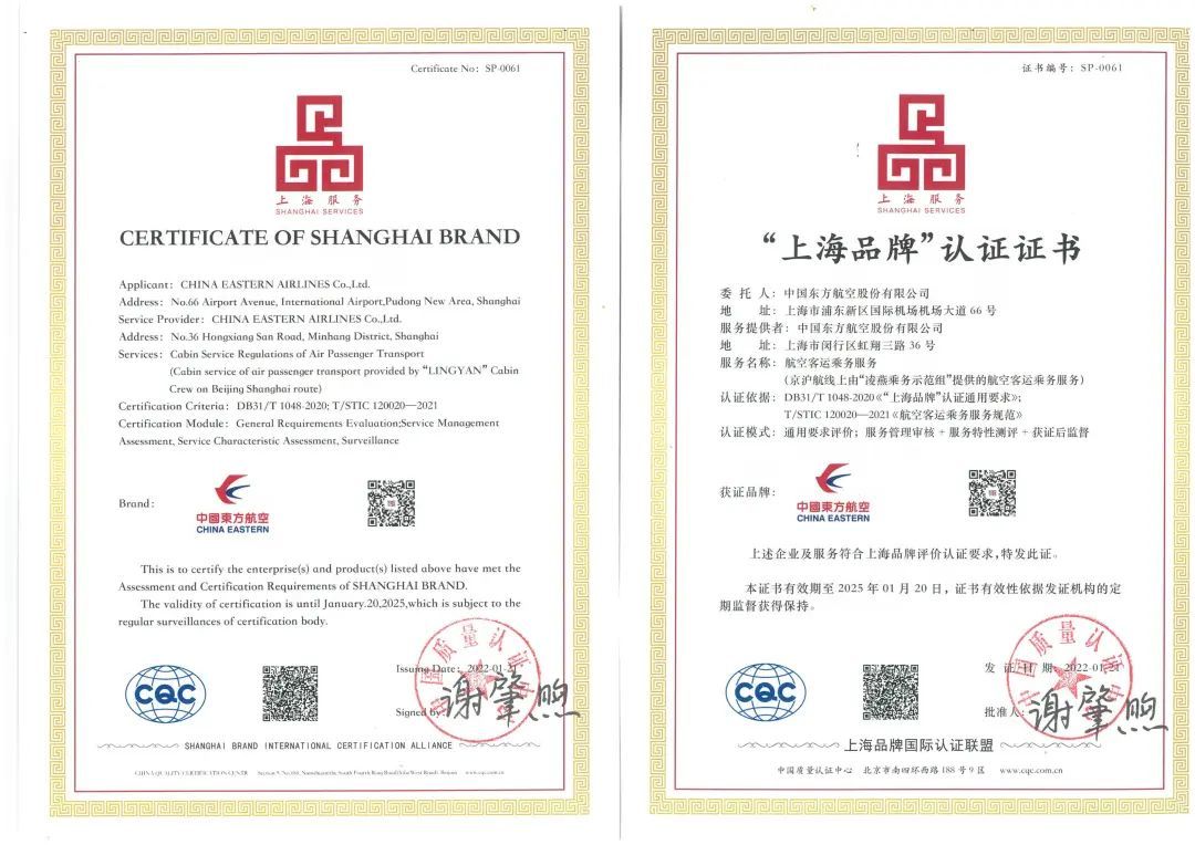 “上海品牌”认证制度实施五周年之际,上海市经过两轮专家评选和网络投票,评出了十大“上品”卓越贡献品牌,中国东方航空股份有限公司参评项目“航空客运乘务服务(京沪航线上由‘凌燕乘务示范组’提供的航空客运乘务服务)”,成功入选榜单。