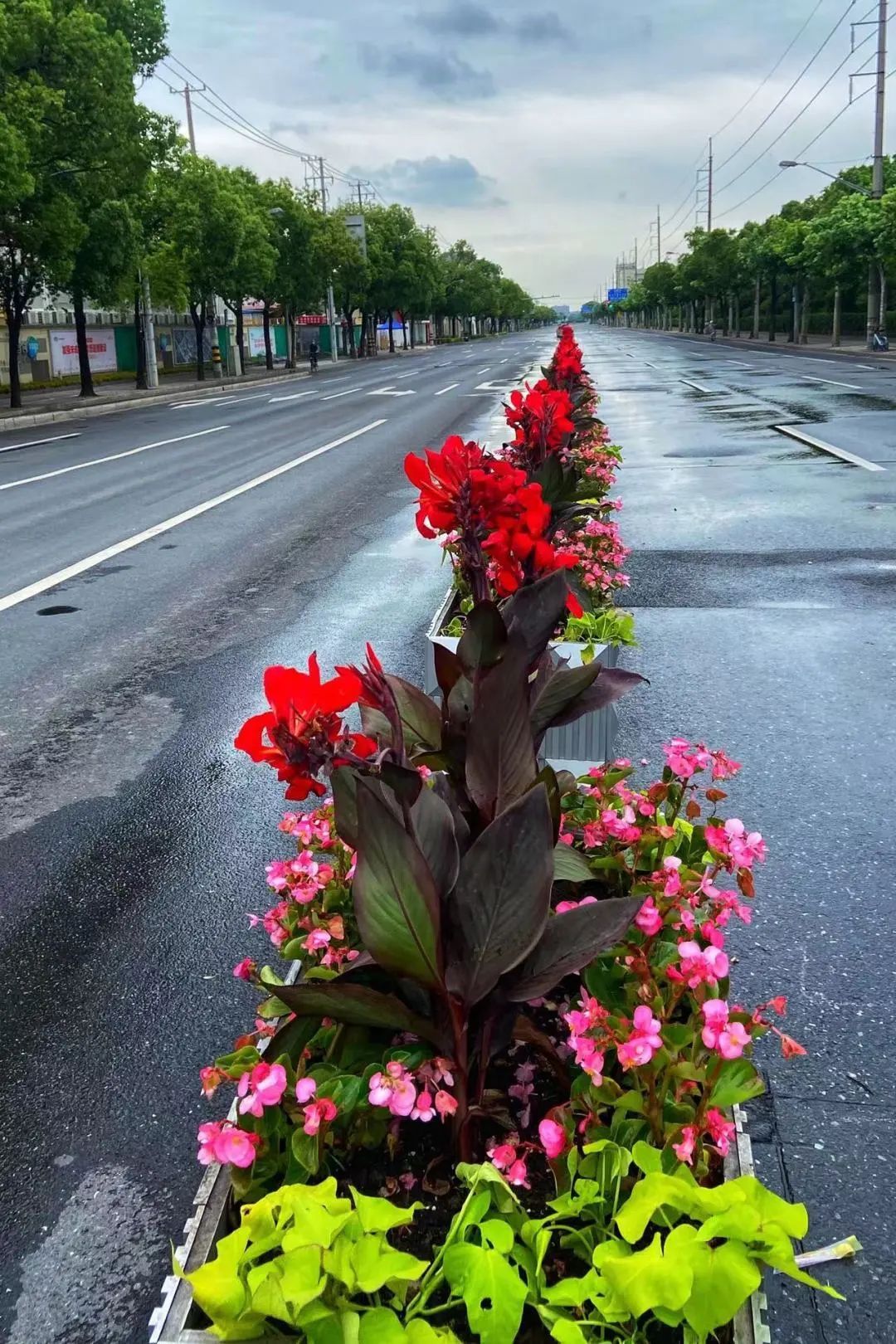红色的美人蕉、粉色的海棠、垂吊的金叶甘薯……祁连山路银色的花箱折射着温暖的阳光,与花朵交相辉映,熠熠生辉。