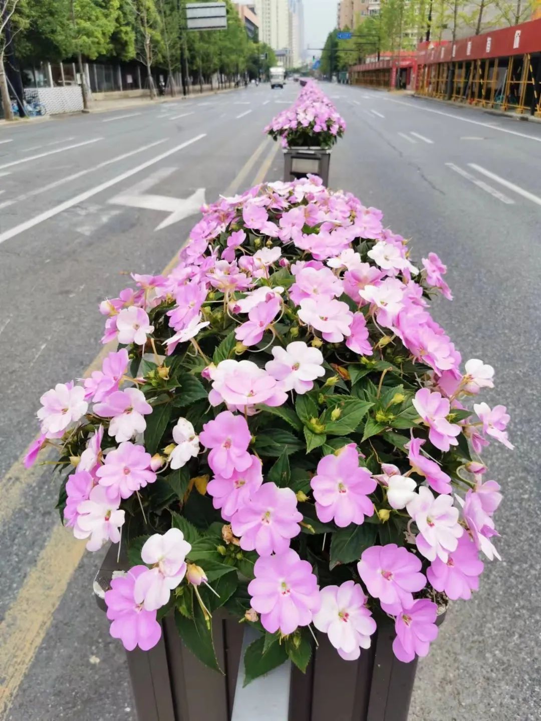 真华南路、真光路花箱内一朵朵超级凤仙,为初夏添加了一抹清凉的紫。