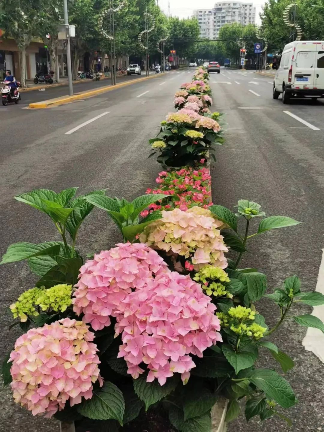 志丹路上明媚的八仙花配上艳丽的红色海棠,带来初夏的清新和自然。