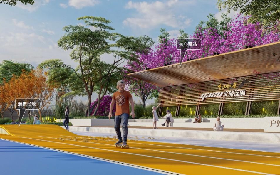 此外,位于朱泾镇区段最西段的G320国道(健康南路—五人港)地块占地面积9067平方米,南侧有朱泾小学,东北侧有西林中学,活动人群以青少年为主。该区域将打造一座促进青少年交流、学习、运动的“泾水棹韵”口袋公园,把船子和尚《拨棹歌》诗集融入景观当中,以拨棹歌互动墙来展示船子和尚诗集,同时设计滑板场地、趣味攀岩墙等为青少年提供一个户外运动场地,局部活动空间中融入党建文化,让学生与周边居民在景观中汲取红色力量,在互动中延续红色血脉,打造成一个“显文化、有温度、传精神”的“港湾”式口袋公园。