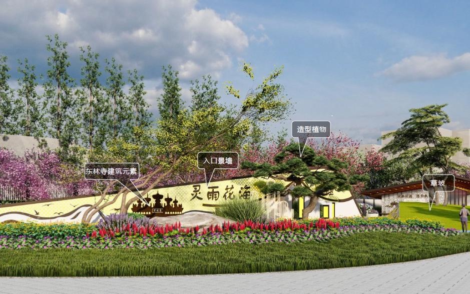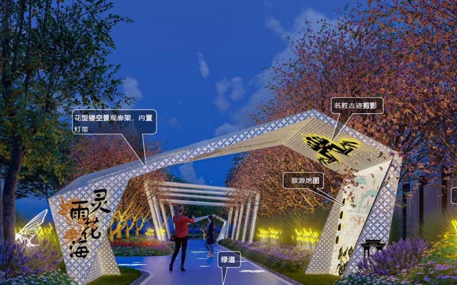 G320国道(罗星南路-东风南路)路段将新建一座占地面积6546平方米的“灵雨花海”口袋公园,该处毗邻朱泾汽车站、东林寺、五福商业广场,人流密度大,是展示朱泾城镇形象的迎宾窗口路。因离东林寺较近,故该园以“荷花”为设计灵感,利用花型金属板设计成景墙、镂空景观廊架,其中内置灯光,使荷花与景观融合,灯光从镂空金属板射出,形成繁花似锦的景观空间。同时,把金山区著名的旅游景点、名胜古迹和文化元素以剪影或文字形式与景墙结合,以此加深市民和游客对金山的印象。