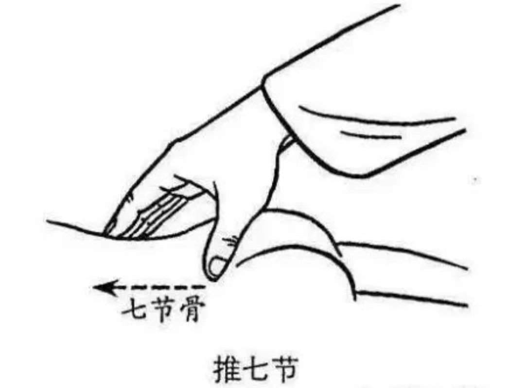 推上七节骨多用于治疗虚寒腹泻。以拇指螺纹面桡侧着力,自下向上做直推法100~300次。达到温阳止泻的目的。