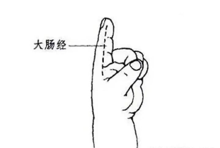 “大肠”位于食指桡侧缘,自食指尖至虎口呈一直线。