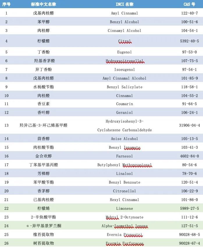 2012年6月欧盟科学委员会(现SCCS,原 SCCNFP)发布关于化妆品中日用香料致敏物的意见,对原 SCCNFP的意见进行了更新。SCCS在此后发表的临床和实验数据回顾表明,有82种物质被视为可能引起接触性过敏的日用香料致敏物(含上表中26种物质),包括54种单一化学物和28种天然提取物,其中12种化学物和8种天然提取物是可能造成消费者过敏的高风险物质。该意见尚在科学评估结论阶段。