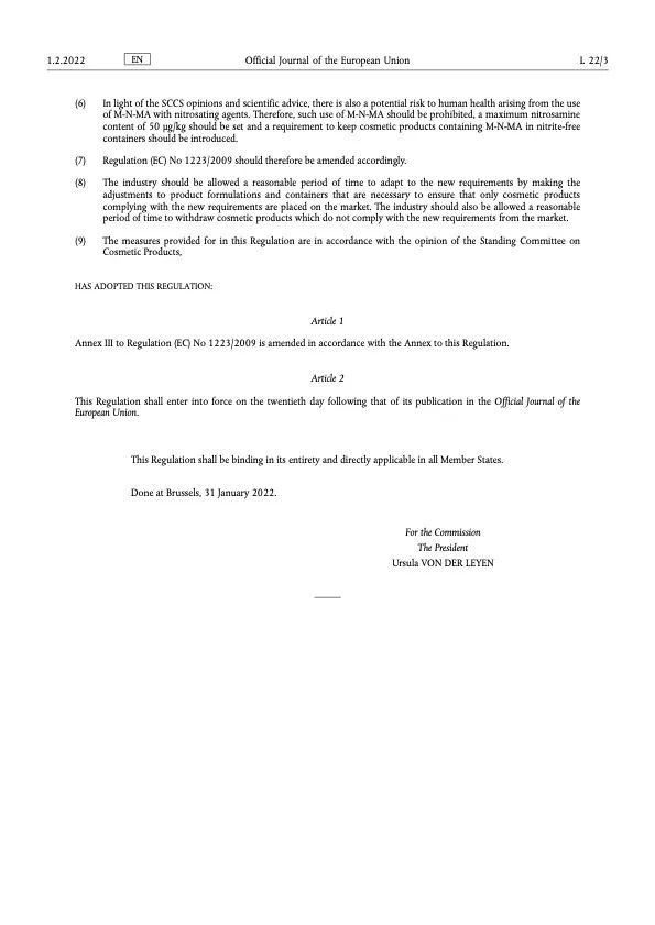 ● 2021年,基于此,欧盟委员会计划对欧盟化妆品法规附录Ⅲ进行修订,新增M-N-MA相关监管规定。