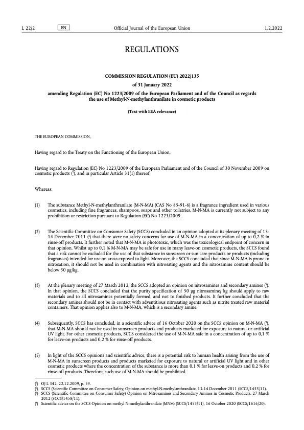2022年2月1日,欧盟公报(Official Journal of the European Union)刊登欧盟委员会第(EU)2022/135号修订案,规定香精成分邻甲氨基苯甲酸甲酯可作为限用物质在化妆品中使用,引发广泛关注。