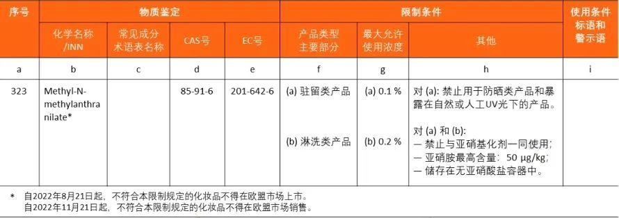 ● 2022年,欧盟委员会将其收录为化妆品限用物质进行监管,就此,欧盟化妆品法规新增附录Ⅲ第323条款,具体限用条件如下表: