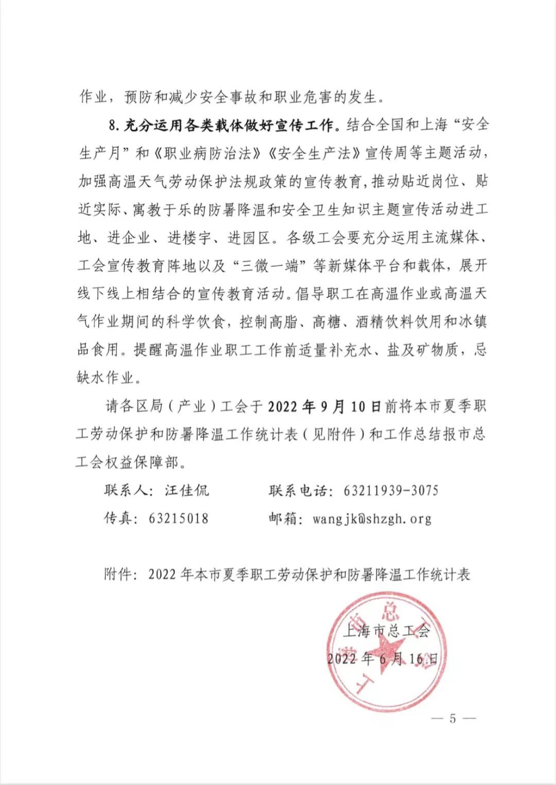 结合全国和上海“安全生产月”和《职业病防治法》《安全生产法》宣传周等主题活动,加强高温天气劳动保护法规政策的宣传教育,推动贴近岗位、贴近实际、寓教于乐的防暑降温和安全卫生知识主题宣传活动进工地、进企业、进楼宇、进园区,倡导职工在高温作业或高温天气作业期间的科学饮食。