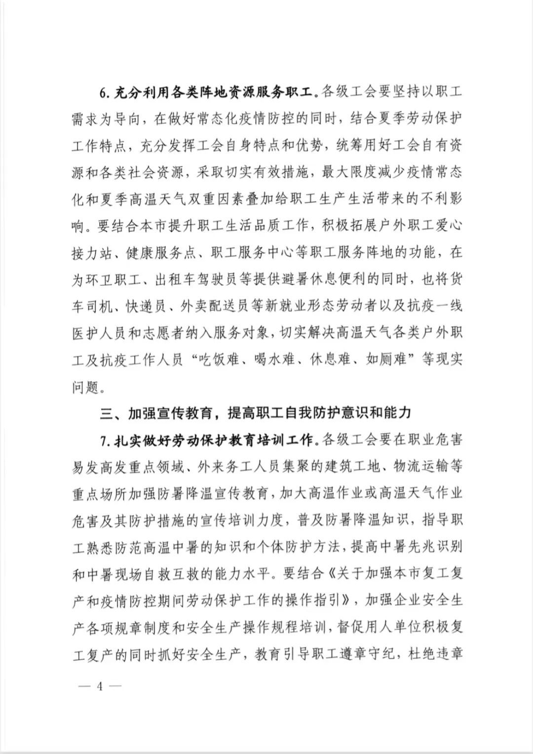 积极拓展户外职工爱心接力站、健康服务点、职工服务中心等职工服务阵地的功能,将货车司机、快递员、外卖配送员等新就业形态劳动者以及抗疫一线医护人员和志愿者纳入服务对象,切实解决高温天气各类户外职工及抗疫工作人员“吃饭难、喝水难、休息难、如厕难”等现实问题。
