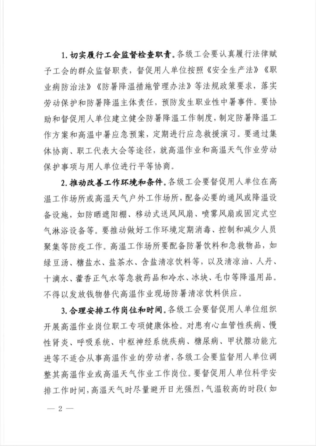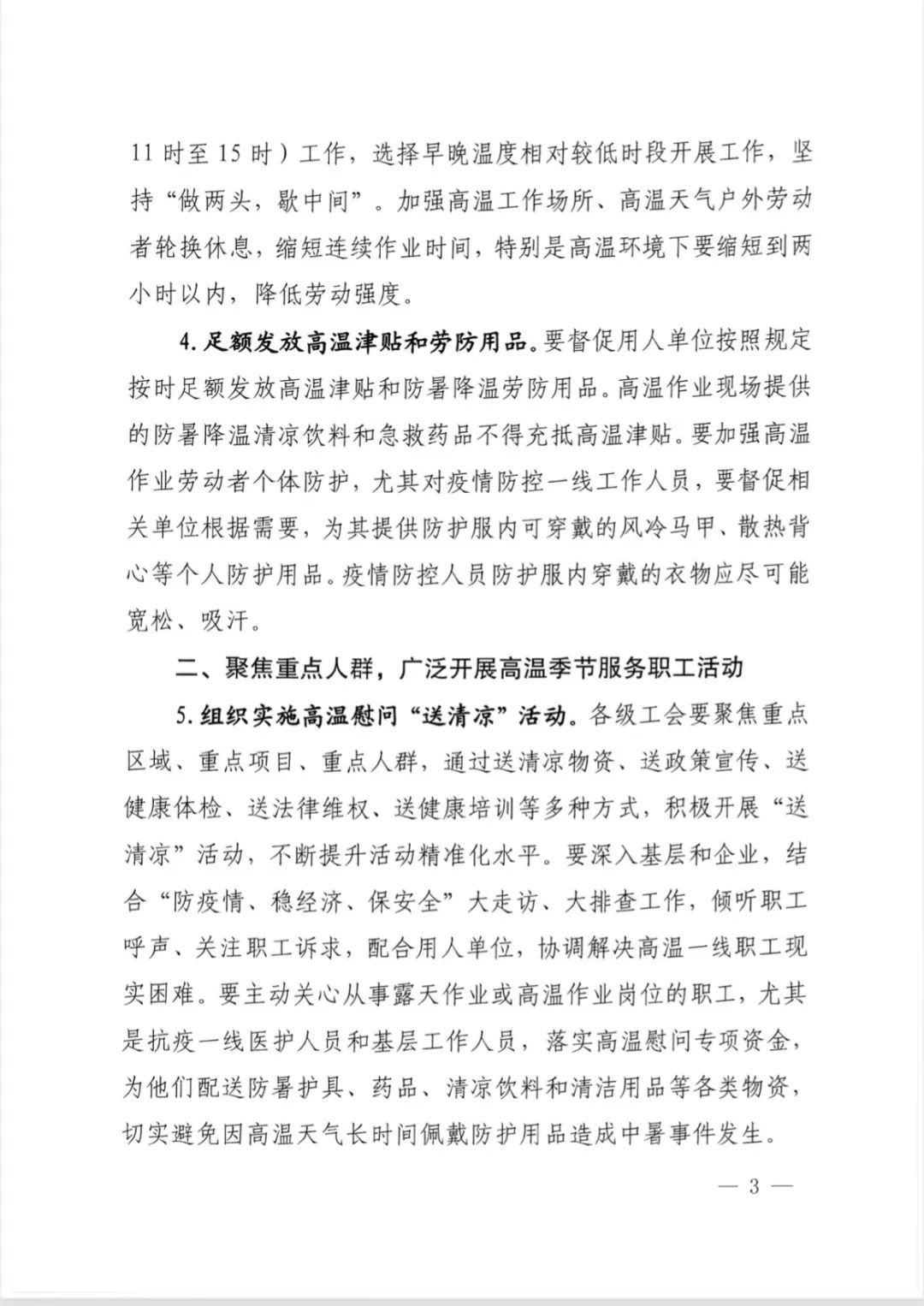 主动关心从事露天作业或高温作业岗位的职工,尤其是抗疫一线医护人员和基层工作人员,落实高温慰问专项资金,为他们配送防暑护具、药品、清凉饮料和清洁用品等物资,切实避免因高温天气长时间佩戴防护用品造成中暑事件发生。