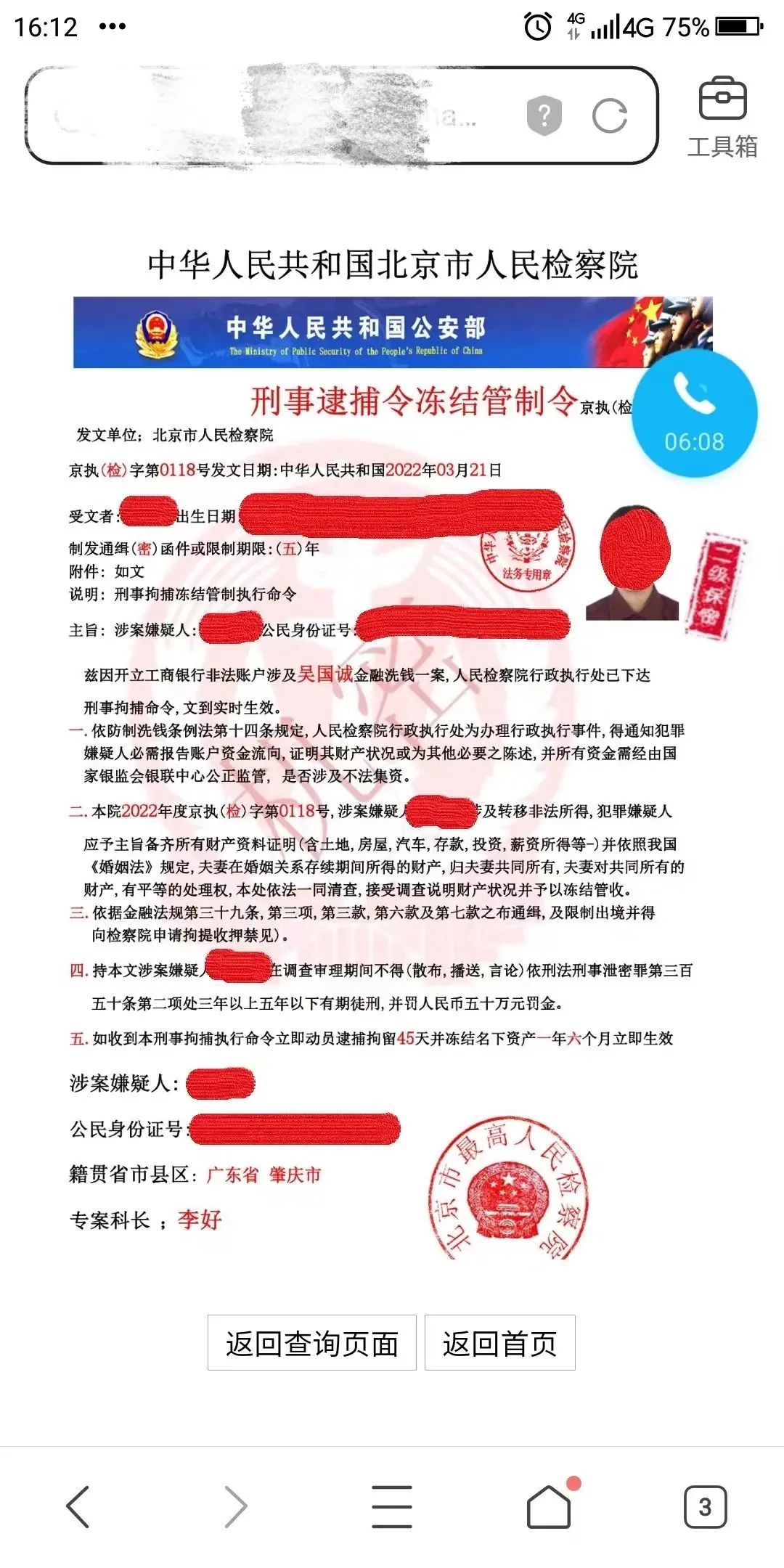 刘女士在和“张警官”的视频通话中,看见对方身穿蓝色制服,便没有怀疑,反而跟据对方指示,在“最高人民检察院”网页里输入了自己的姓名、身份证号码来查询她的“涉案相关信息”。当她看到网站上出现一张“全国通缉令公告”,上面写有自己的身份信息、联系电话以及“犯罪行为”后陷入慌乱,信以为真。