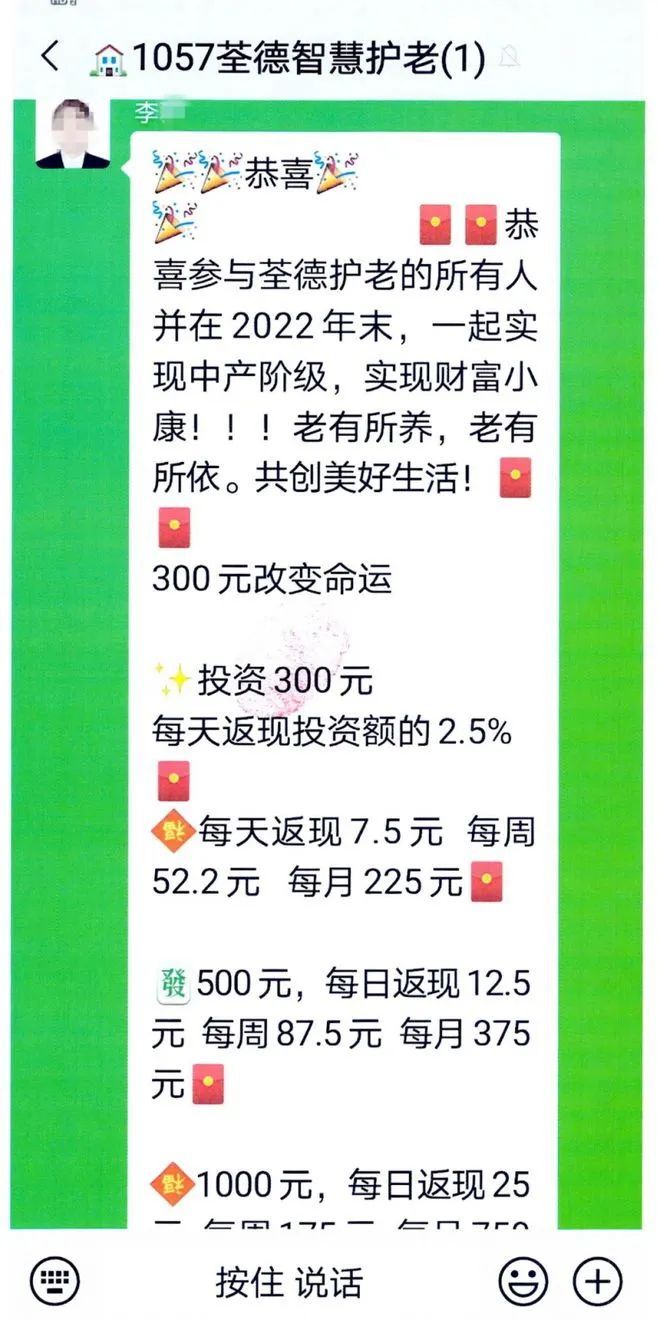 随后王某便将张女士拉入了一个养老投资微信群,群主每天发“荃德智慧护老”项目的相关资料,宣称该项目是国家支持建设的先行示范养老项目,投资该项目后每天会有2.5%的返现,并且项目完成以后投资人将自动成为该项目的会员优先免费享受养老服务等。