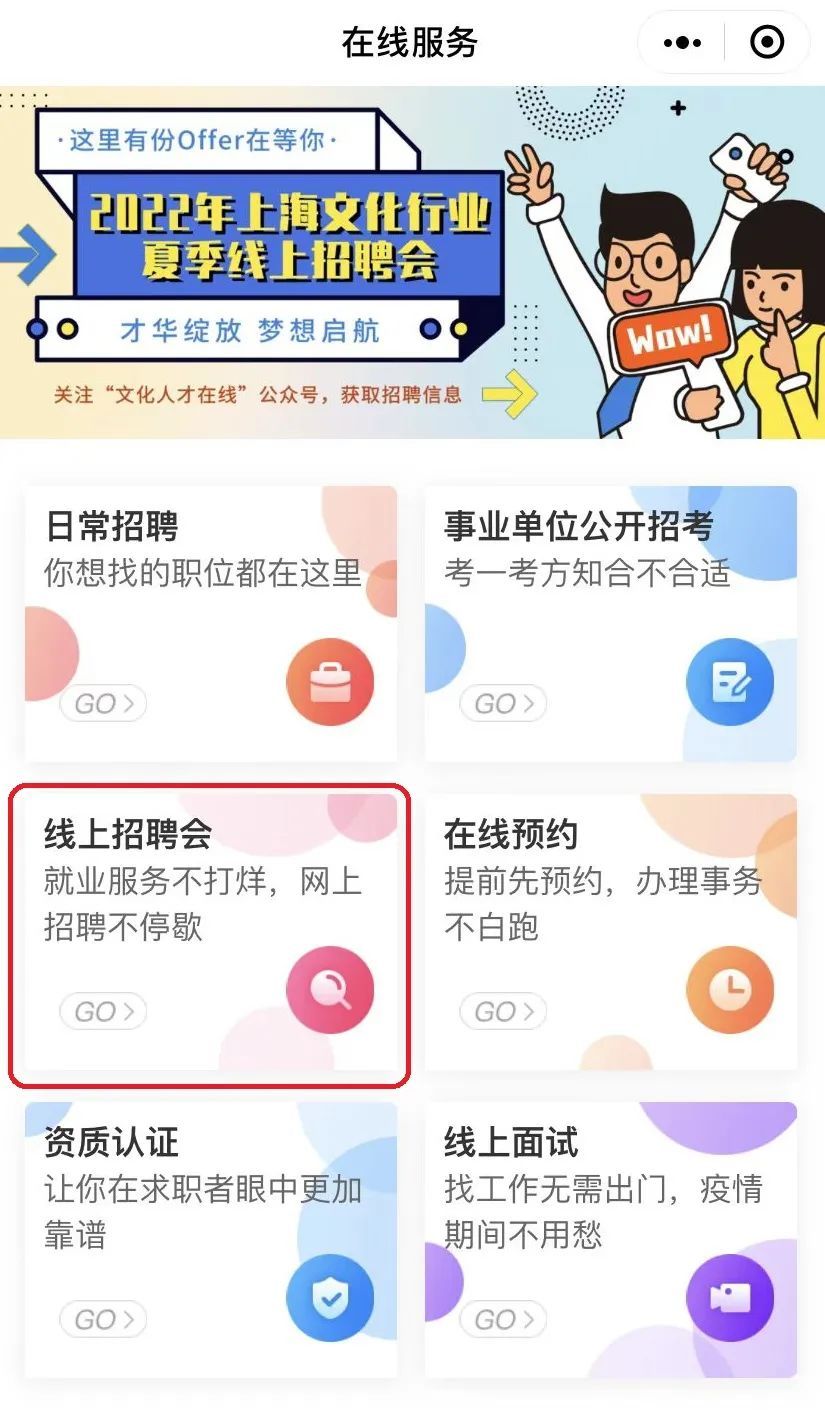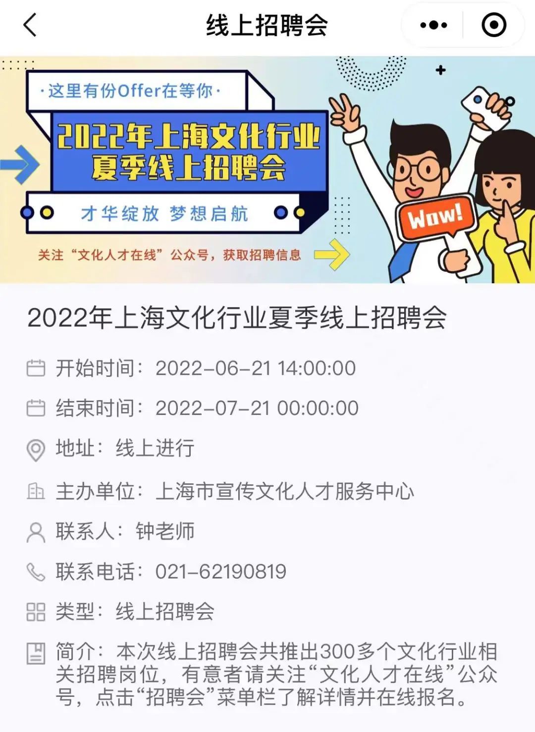文化人才在线介绍,“2022年上海文化行业夏季线上招聘会”正式启动。本次线上招聘会共推出300多个文化行业相关招聘岗位,招聘单位包括上海东方报业有限公司、上海新民社区传媒有限公司、上海人民出版社等40多家上海市知名文化行业企事业单位,包含新闻出版类、新媒体运营类、管理类、企划宣传类、IT类等众多岗位。有意者请搜索“文化人才在线服务”小程序,进入“线上招聘会”栏目即可,详见↓