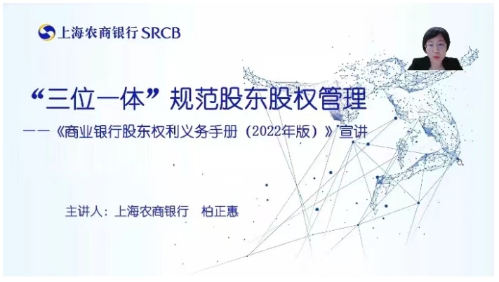 专题培训环节,上海农商银行董事会办公室副主任柏正惠以“三位一体”规范股东股权管理为题,围绕《商业银行股东权利义务手册(2022年版)》,从良好公司治理的内在要求、“严监管、常态化”的监管趋势以及股权管理乱象丛生的市场现状等方面阐明了强化股东股权管理的原因和背景,强调商业银行股东股权管理的特点和原则。同时,详述了“三位一体”框架下的股东权利与义务,按照主要股东、银行、监管的责任义务分别展开,重点解读了股东在出资、治理行为、人员管理、股权变更与质押、关联交易、信息报告与披露等方面的责任与义务,旨在使股东“对号入座”,知悉其需履行的责任义务。此外,还展示了股东自入股到退股,贯穿全生命周期的股权管理要求,覆盖资质准入、承诺履行、信息监控、行为监管、违规限权、强制退出等多个环节,引导股东步步为营,持续、动态地规范自身行为。