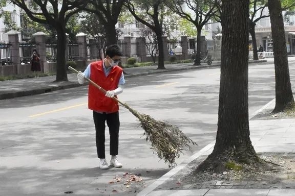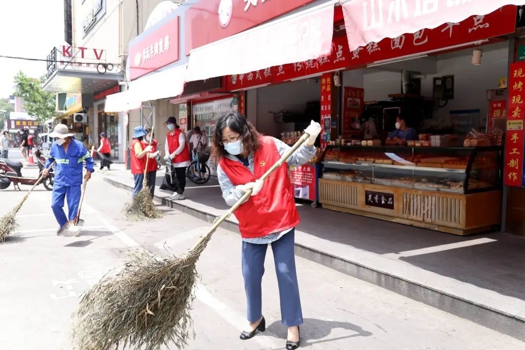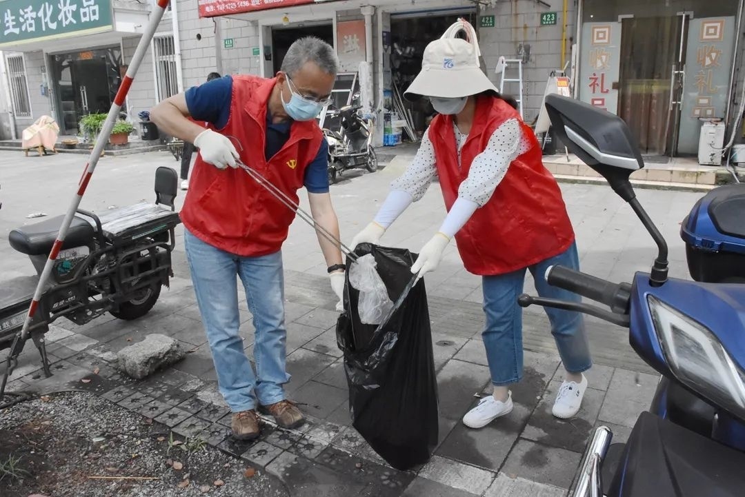 在石化街道梅州菜场附近,党员志愿者们以组为单位,清扫沿街道路并清理垃圾。对于周边商铺的占道经营、商品乱放等现象,志愿者们也进行了劝阻。