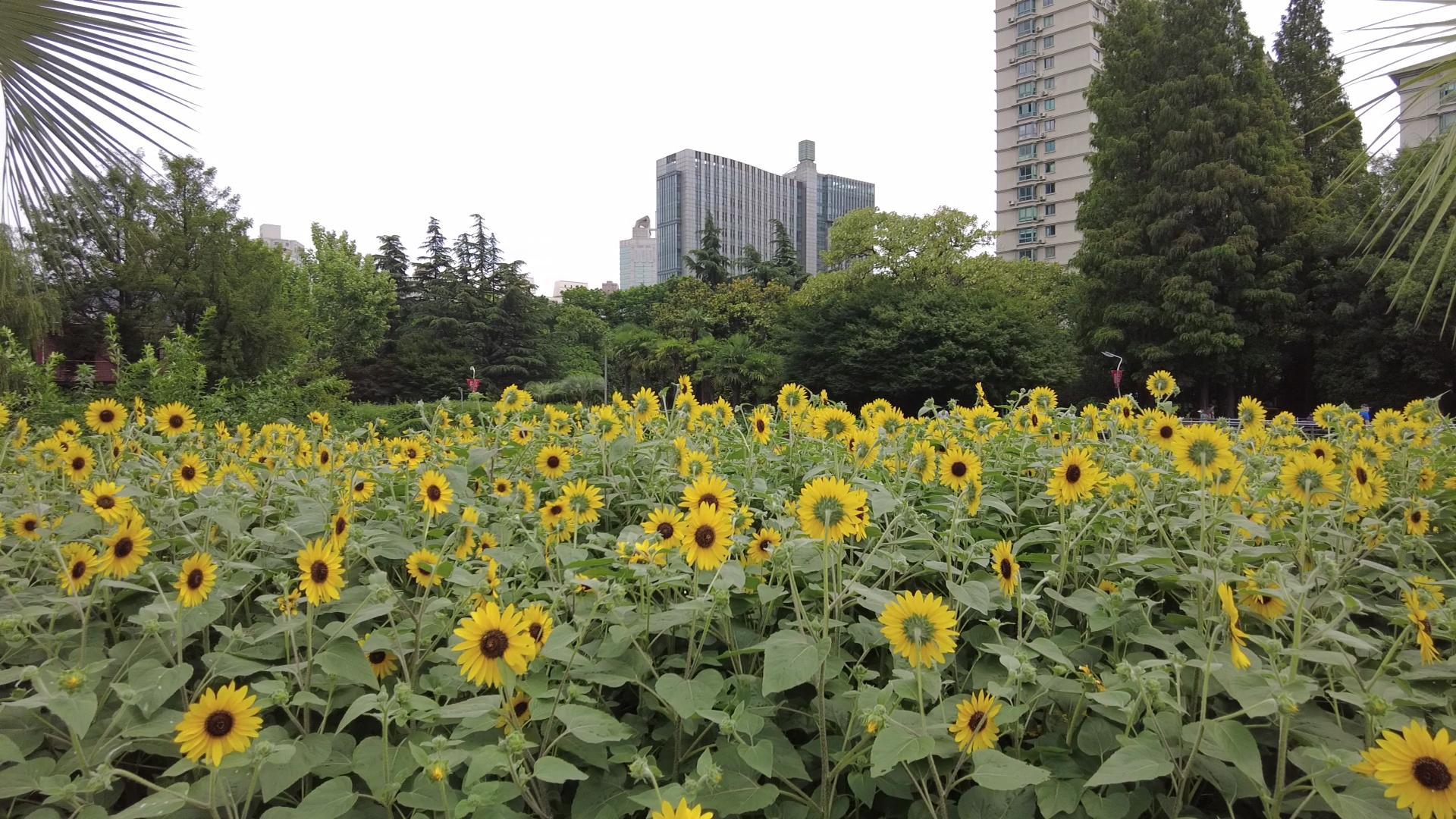 南园滨江公园错落有致地种植了 “金富贵”“无限阳光”两个品种的向日葵,种植面积为一千八百多平方米,中心花坛种植共计七千多株。在微风中,向日葵摇曳着身姿,其茎杆上嫩绿色的叶片相对而生,花瓣内有多个花蕊,时刻面朝着阳光茁壮成长。