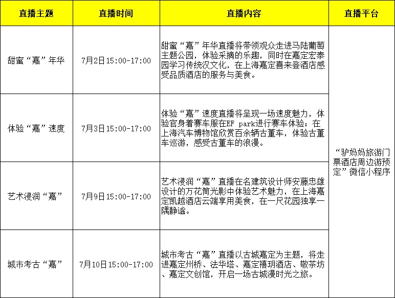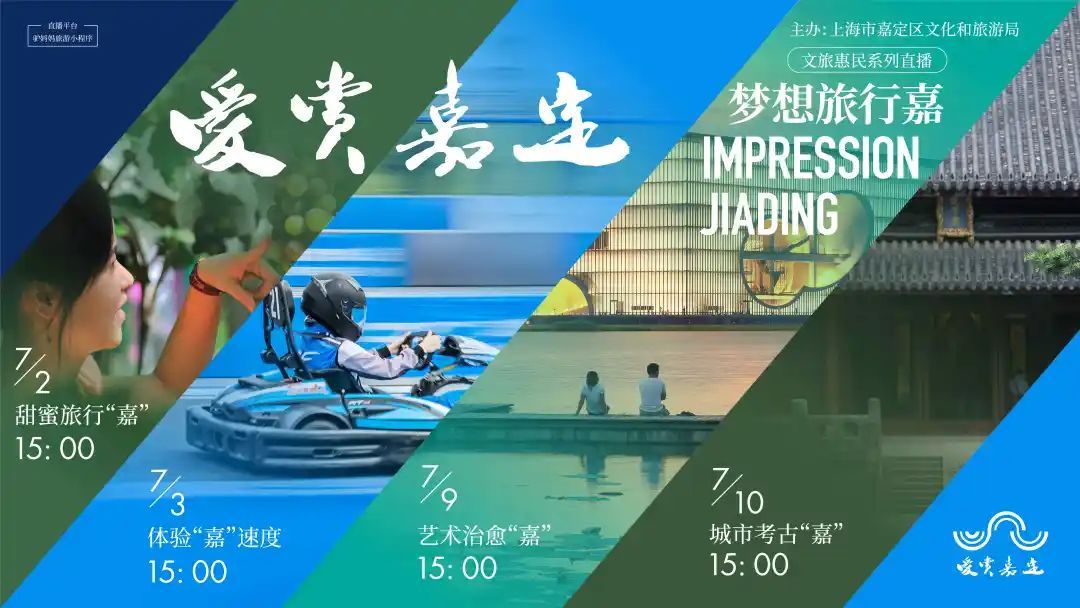 7月2日起,“爱赏嘉定· 梦想旅行嘉”大型文旅惠民沉浸式体验直播,四条嘉定旅游精品主题线路——甜蜜“嘉”年华、体验“嘉”速度、艺术治愈“嘉”、城市考古“嘉”,将连续两周周末在驴妈妈旅游微信小程序直播间一一呈现。