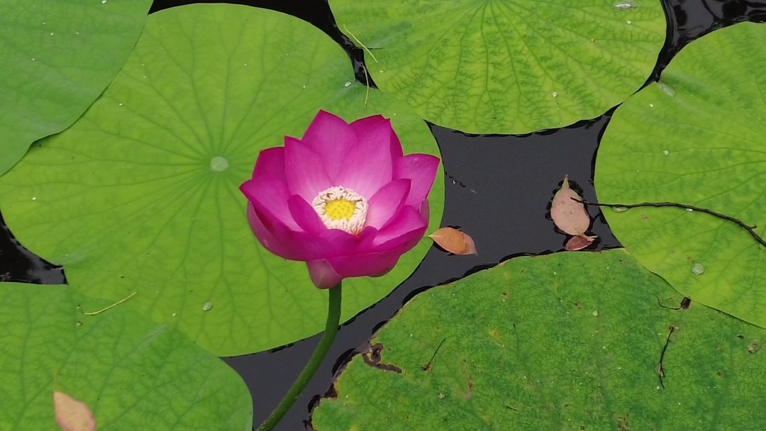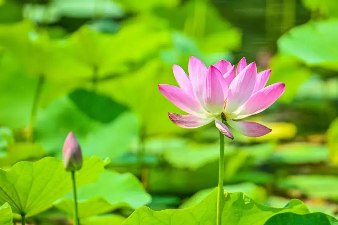荷叶罗裙一色裁,芙蓉向脸两边开。苍翠茂盛的田田荷叶犹如小伞似的,铺满了整个池塘,呈现出“万绿丛中一点红”的迷人景致。