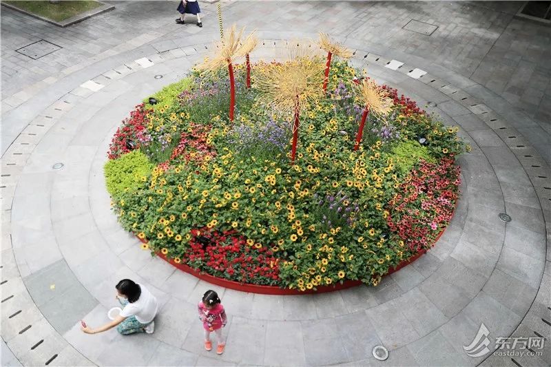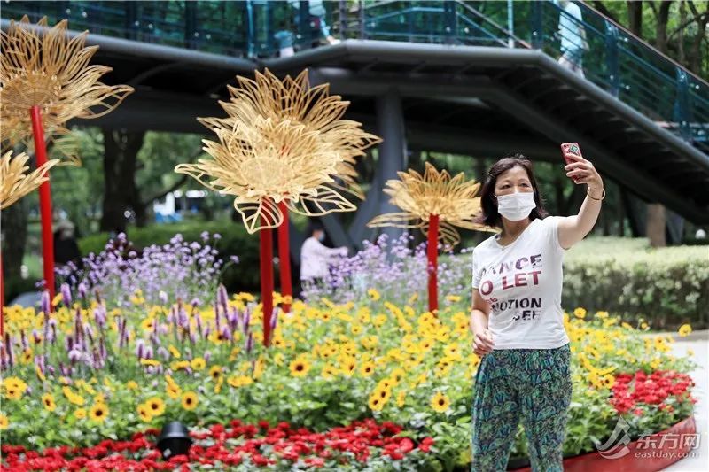 在徐家汇公园,一组名为《我心向党》的主题景点吸引市民驻足观赏,该景点面积约30平方米,半径3米直径6米,呈正圆形。中心五朵金灿灿金属编织向日葵错落有致,象征着全国人民群众一心团结在党中央的周围,拥护着中国共产党。地面植材亦采用大量的园艺向日葵、松果菊、马鞭草 、欧月季、金叶满天星等,色彩热烈既丰富又统一,象征着中国人民的生活丰富多彩,幸福美好。