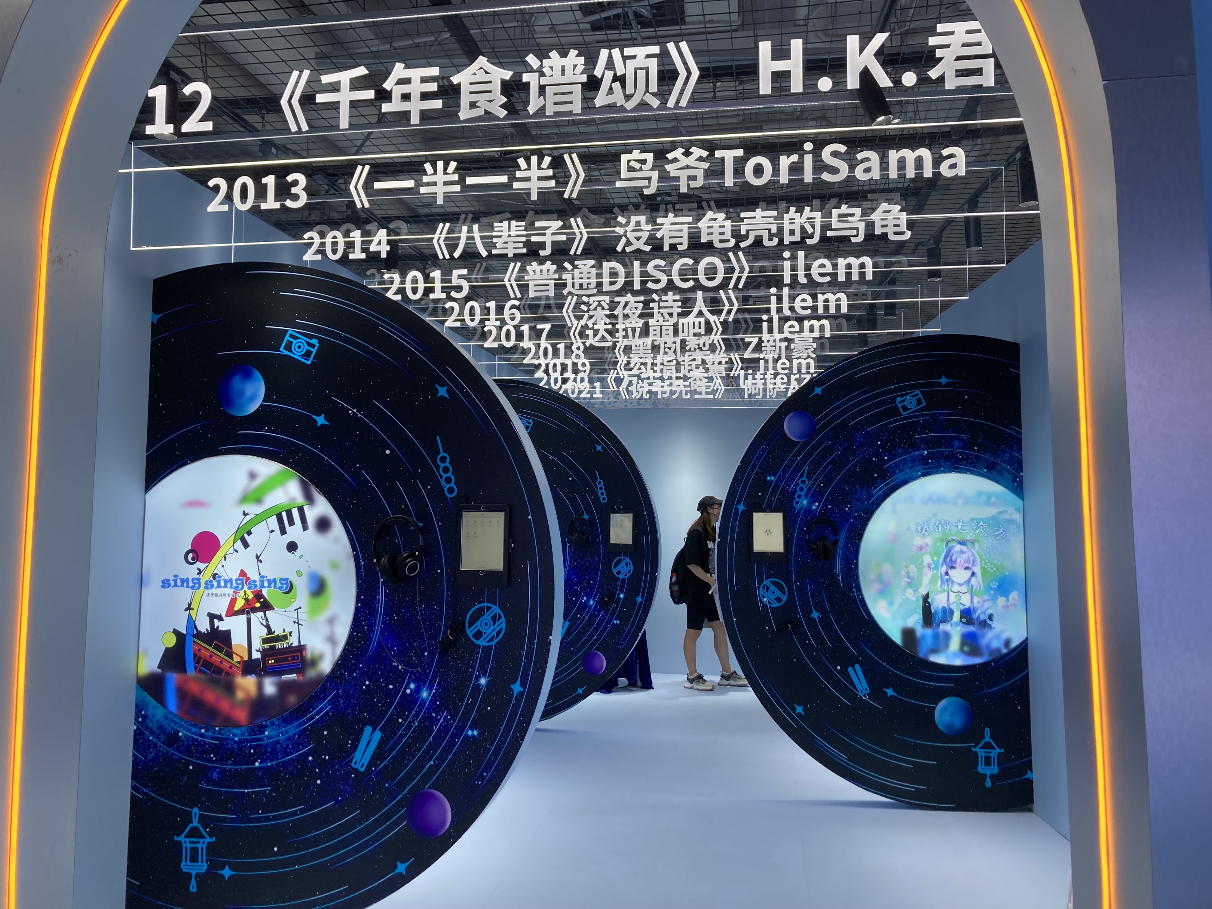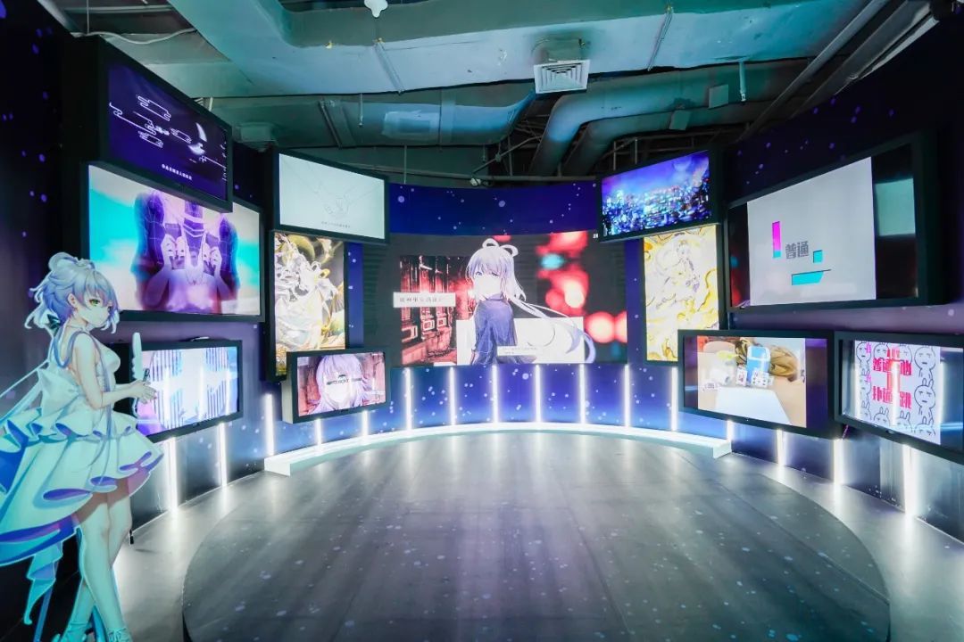 如果说中庭展区是洛天依向大众展示的一个窗口,那么沉浸式展示区则是对洛天依十年足迹的完全展示。歌曲、立绘、舞台……可谓一场大型声像"回忆杀"。