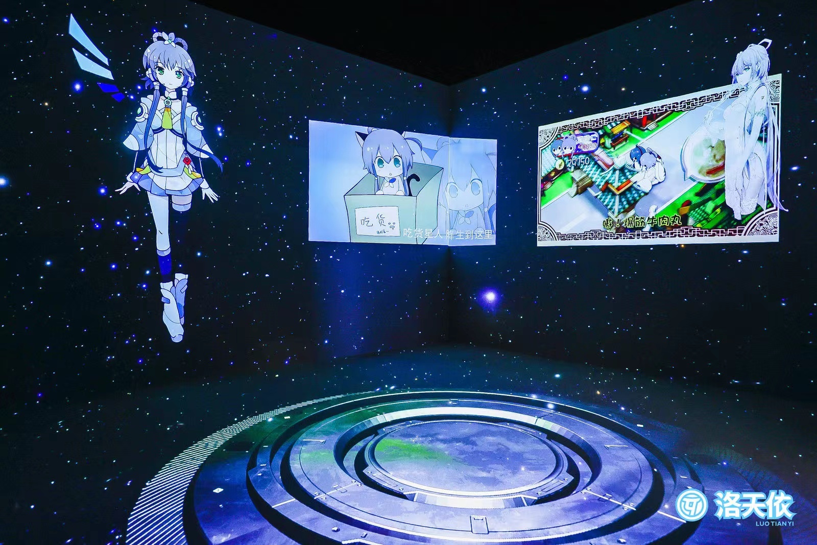 本次展览位于静安大悦城的南区三层,观众需扫描场所码进入展览现场,展览分为免费互动体验区和沉浸式展示游览区。互动体验区围绕着中庭,以"星空之约"为主题,共设计6大互动区,这也与洛天依的最初设定——“一位从外空而来的虚拟歌手“相契合。